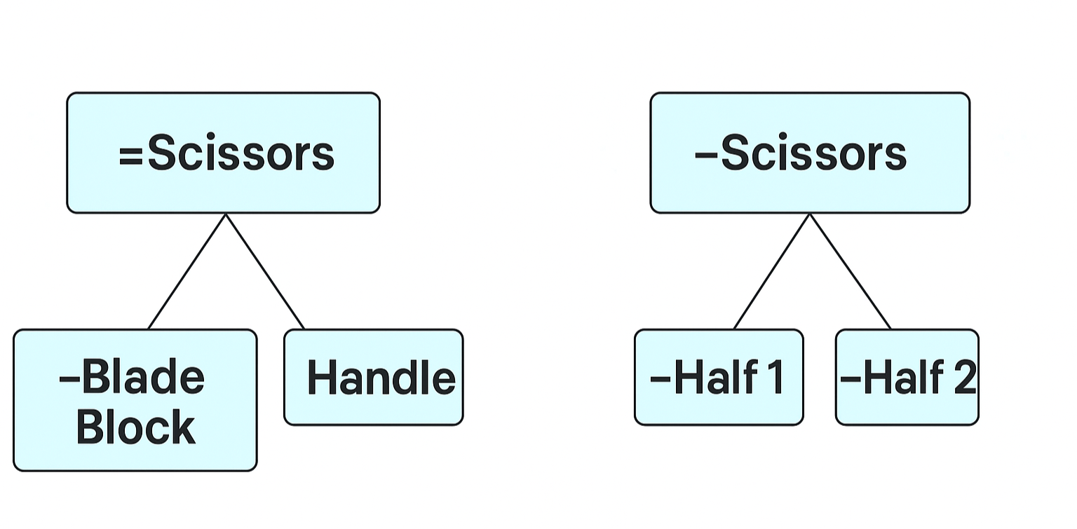 Note that all these descriptions do not coincide with each other. It is especially difficult to notice the mismatch between the functional and modular descriptions. Usually, developers define the main function of the system and consider the system as a functional object consisting of functional subsystems. The architect then determines which structural modules (executors/performers) will play these roles. The correspondence between functional and modular parts does not have to be one-to-one, and the names of these parts may differ. Look at the example with scissors, where the functional parts are the blade assembly and the handle, while the modular parts are half 1 and half 2.