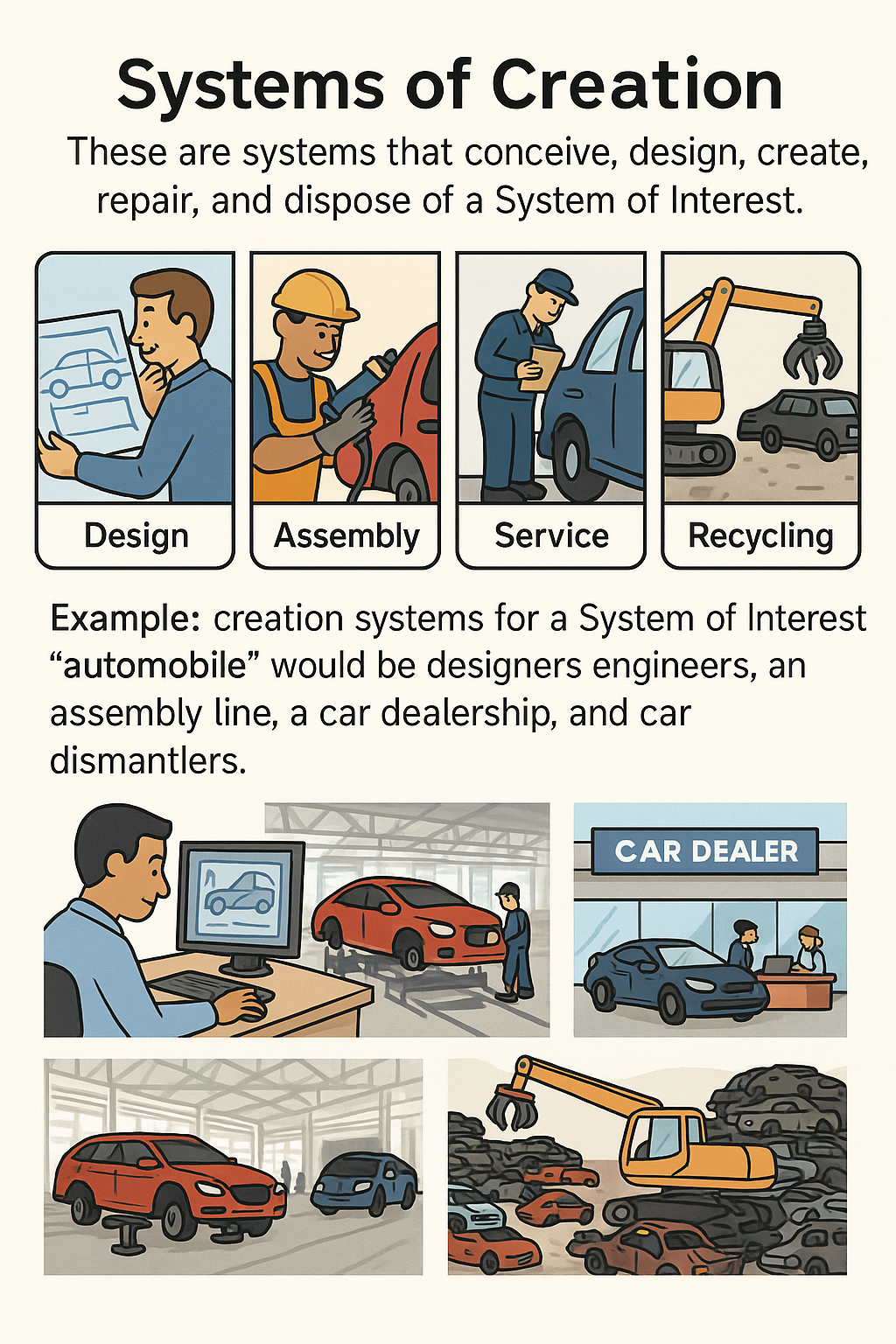 An important note regarding creation systems is that you should not call an activity a system of interest. First, an activity is not a system (neither a system of interest, a creator, nor any other kind). Second, when you observe an activity, it is most likely the activity of certain creation systems that are producing a particular system (either a system of interest or our system). More precisely, you first need to determine: why is this activity being carried out? Most likely, it is aimed at creating a system. That system is likely to be the system of interest, while what you are engaged in—such as factory activity—is merely the activity of certain creation systems.