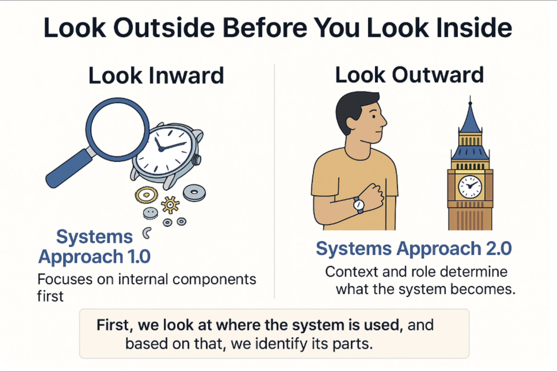 For example, in the classic consideration of the "clock" system, a person would start by examining the system's properties and focus inward, discussing what it consists of. In the modern approach, you must start by looking outside the system—considering which supersystem the clock is part of, who needs it, and how it is used.
