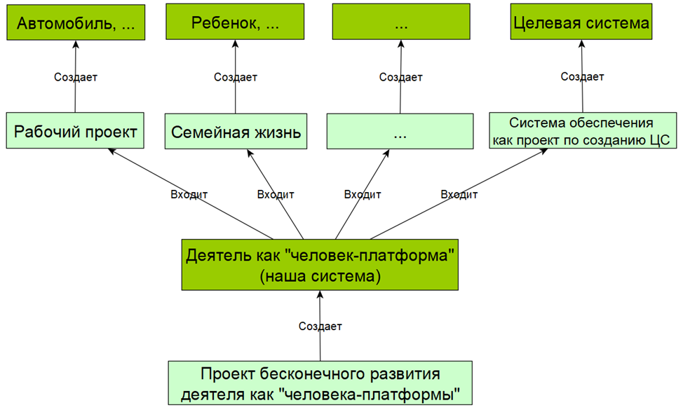 Исполнение многочисленных ролей человека-создателя можно привязать к разнообразным проектам. Человек-создатель в определенных прикладных ролях участвует в проектах по созданию разных систем, то есть человек в разных прикладных ролях входит в состав команд проектов. Например, это рабочие проекты, семейная жизнь, проект саморазвития и другие проекты, которые вы собирали, начиная с первого домашнего задания по руководству. Жизнь как процесс можно разбить на многочисленные проекты, которые будут системами создания для разных целевых систем. Примеры целевых систем: