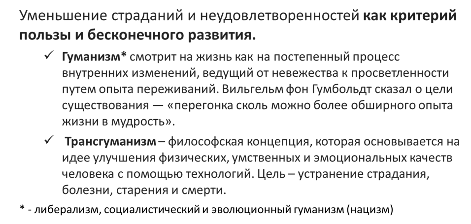 Практически все религии говорят о сострадании. Светские теории (идеологии), такие как гуманизм, тоже стремятся сделать жизнь людей намного лучше. Все идеологии направлены на то, чтобы люди меньше страдали и были счастливы, во всяком случае никто не заявляет обратного. Либерализм, социализм, или эволюционный гуманизм (или нацизм) – руководствуются идеями гуманизма[1]. Просто каждая из религий и каждая идеология подразумевают свои средства и свои представления о том, каким людям нужно облегчить страдания, и за счет кого сделать жизнь лучше. Мы не будем обсуждать отличия разных теорий сострадания, а только констатируем, что сострадание является распространенной концепцией, и ее можно взять в качестве смысла бесконечного развития.