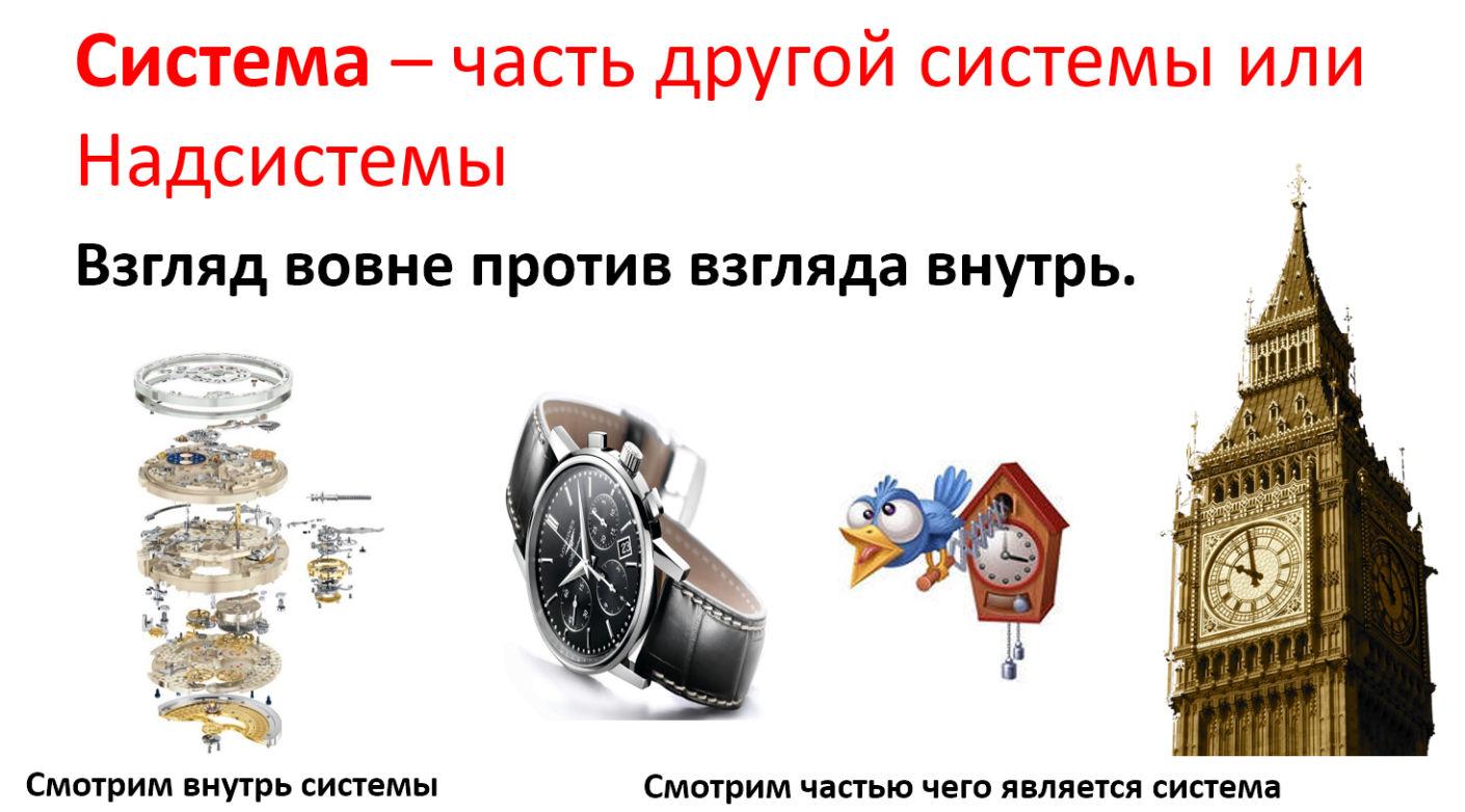 Например, в классическом рассмотрении системы «часы» человек начал бы разбираться со свойствами системы и обратил внимание внутрь системы, то есть начал обсуждать, из чего состоит система. В современном рассмотрении необходимо начинать со взгляда вовне системы, то есть смотреть, частью какой надсистемы являются часы, кому они нужны и как используются. После такого рассмотрения понимаешь, что речь идет о часах наручных, или о часах с кукушкой, или о часах в составе башни. При этом устройство всех этих часов будет разным[3].