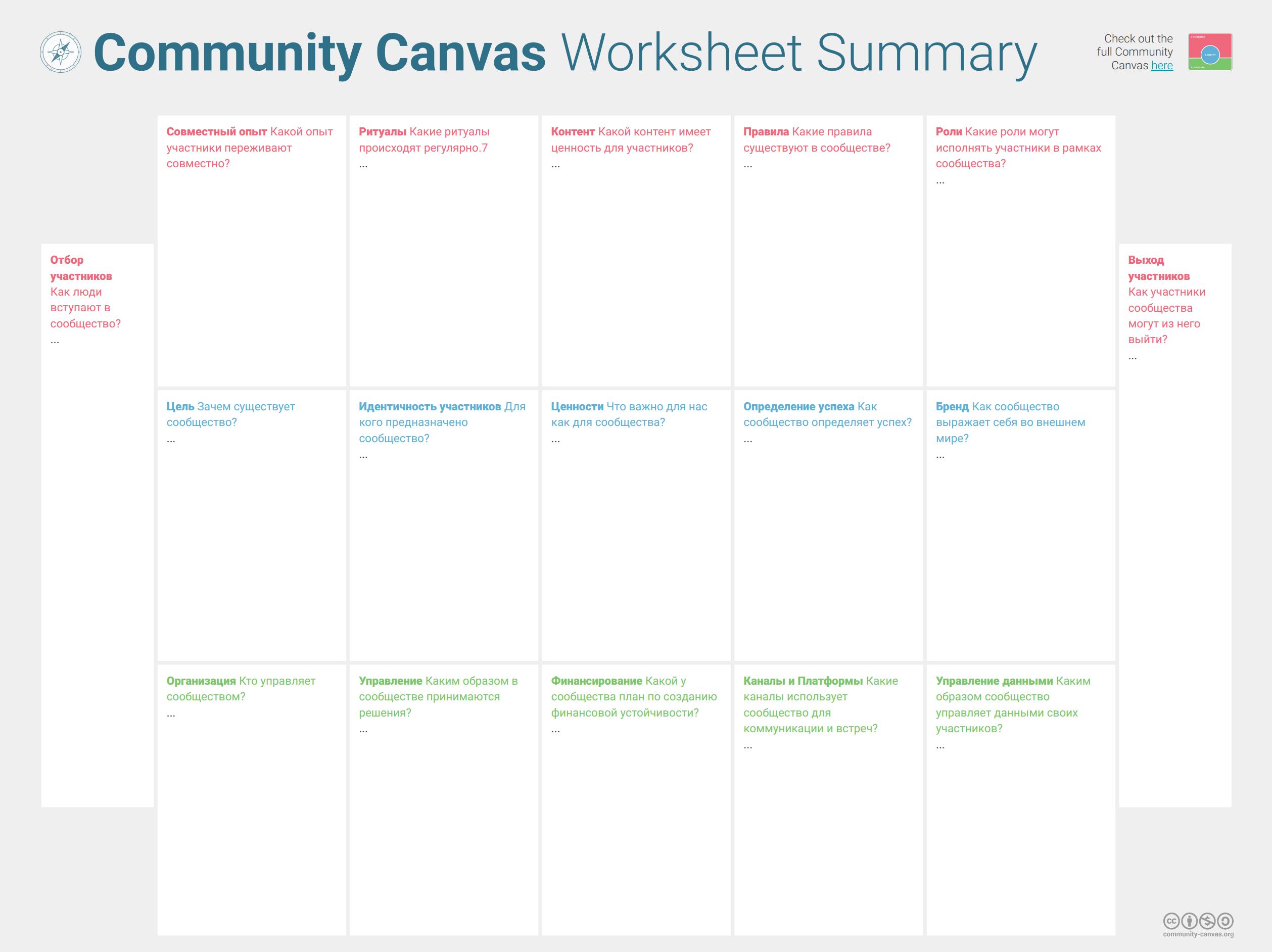 В качестве иллюстрации разных тем обсуждения в менеджменте сообществ приведём пример[17] канвы, используемой как чеклист создателями сообщества: