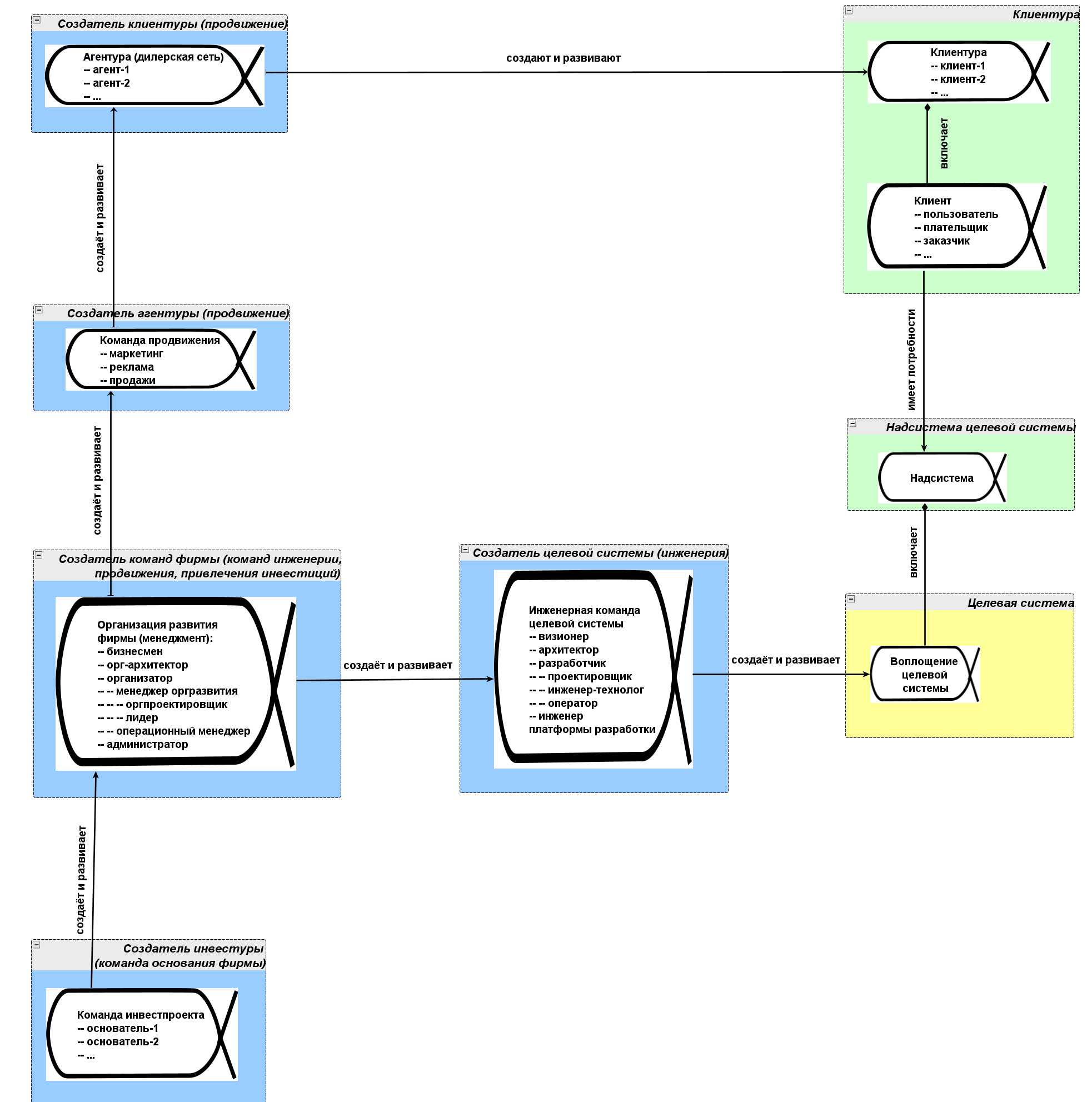 Пока нас интересует обсуждение графа создателей. Поэтому покажем в каждой области интереса только альфу системы и свяжем все эти системы отношениями создания — опустим пока показ описания, методов работы и работ систем. При этом покажем отношения создания: фирма создаёт агентскую сеть (агентуру), которая приносит клиентов (клиентуру), у которых есть надсистемы, в которых и будет использоваться наша система. Про основателей фирмы помним, но инвестуру (инвесторов, которых основатели фирмы создают из владельцев свободных денег) прописывать не будем. Задача: отмоделировать все эти альфы как объекты внимания в предприятии, чтобы чего не забыть, когда мы меняем состояния этих систем в предприятии.