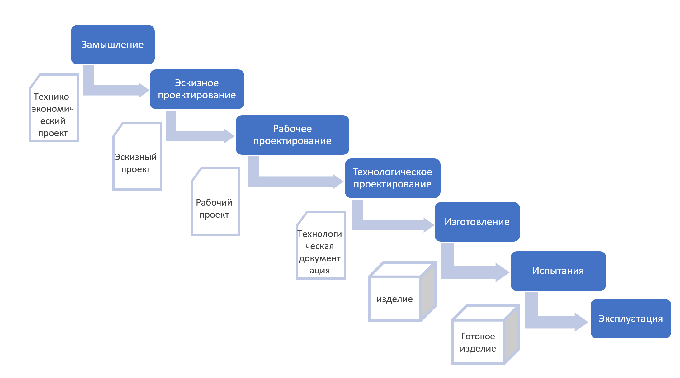 Первый вид жизненного цикла (квинтэссенция подхода 1.0, «проектное управление с непересекающимися стадиями») получил название «водопад**»** (cascade, каскад). Работы каких-то методов (например, эскизное проектирование) жизненного цикла выполняются однократно, результирующие предметы этих работ (предметы работы называют обычно рабочие продукты, артефакты, а результирующие предметы работ — output) однократно и одномоментно передаются как input-ресурсы для следующих работ, и в теории считается, что больше к этим методам работы никакого возврата нет, ибо выполняются работы последующих этапов по последующим методам работы. Скажем, после выполнения работ по эскизному проектированию эскизный проект как их результат становится входным предметом работы для рабочего проектирования, и повторно эскизного проектирования уже в проекте не будет. Водопад/каскад течёт всегда сверху вниз**, назад возвратов нет!** Для более убедительной иллюстрации этого «невозвратного» хода работ традиционную «колбаску» начали рисовать как ступени настоящего водопада, но это всё та же «колбаска»:
