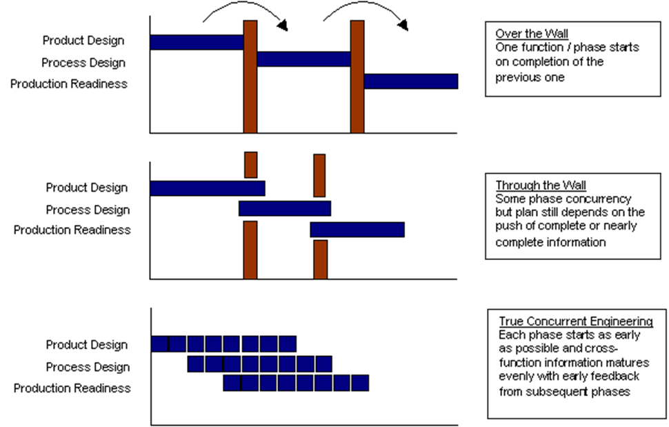 Вот типичная картинка объяснения перехода к параллельной/concurrent инженерии (и на ней хорошо видно, что сроки всех работ по созданию системы при этом существенно сокращаются)[2]: