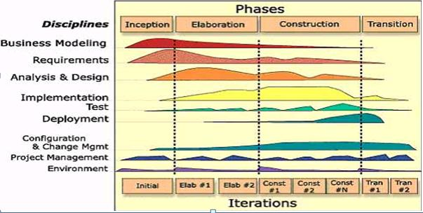 Работы по методам, описанным разными дисциплинами на «горбатой диаграмме» как-то распределены по времени жизненного цикла в его начальном (1.0) представлении («жизненный цикл — это последовательность работ»). В RUP это работы по практикам организационного моделирования (business modeling, помним про перевод business как «организационный»), инженерии требований (уже устарела со времён популярности RUP), анализа и проектирования (анализ как отдельный метод работы не рассматривается, он включается в проектирование), разработки (границы этой практики определяются сейчас по-другому, ведь диаграмме около 30 лет!), испытаний (сегодня это инженерные обоснования, quality assurance), разворачивания (но вот delivering как «введение в эксплуатацию» в RUP нет, это не считалось трудозатратным — «акт подписать»), управления конфигурацией и изменениями, управления проектом, работы с окружением/environment. И это никак не закольцовано, хотя и выделены «порции работ по всем методам создания и развития вместе» как «итерации» — но это просто отражение «постепенного достижения конечного результата», а не получение сначала MVP (создание), а затем развитие, развитие, развитие, то есть не длительная эволюция без явного достижения заранее определённой цели. Нет, подразумевается, что «определили требования, повозились с проектированием и изготовлением, убедились, что удовлетворили начальные требования — всё, проекты жизненного цикла закончены, даже если этих проектов было несколько, всё развитие как продолжение работы над системами подобного класса — за рамками жизненного цикла».