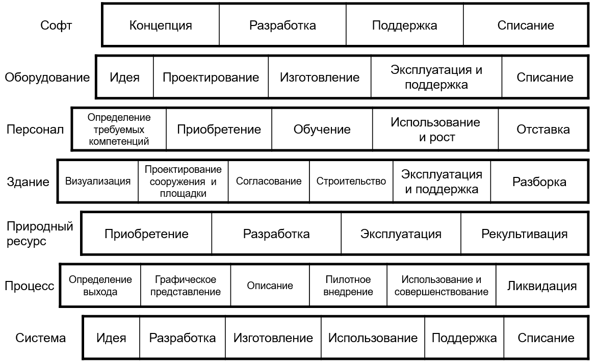 Нижняя строчка с создаваемой «системой» там представляет собой один из вариантов типового**/обобщённого** жизненного цикла, который в том или ином виде может быть определён для почти каждого типа целевой системы. В нашем руководстве мы вместо «идея» говорим «замысливание», вместо «использования» и «поддержки» — «эксплуатация», вместо «списания» — «ликвидация/уничтожение». Вы можете предложить и свой вариант: главное тут в том, что жизненный цикл распространяется и на работы с описаниями системы (проектирование/разработка), и на работы с воплощением системы (изготовление, эксплуатация).