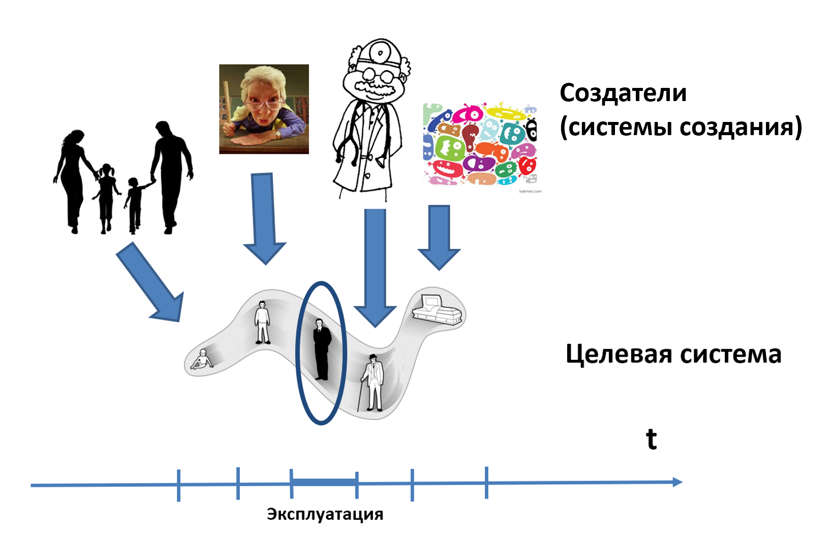 Системное мышление обращает внимание тут на типы объектов: целевую систему, системы в окружении, системы в графах создателей, методы работы и работы по этим методам — и так далее по мантре системного мышления. В рассуждениях про создание и развитие человека (раньше это бы назвали «жизненный цикл человека») должны быть учтены они все, все оставаться во внимании при мышлении о развитии человека. Если вы о чём-то из этого списка не подумали, то в проекте вас ждут сюрпризы, и не все из них будут приятными.
