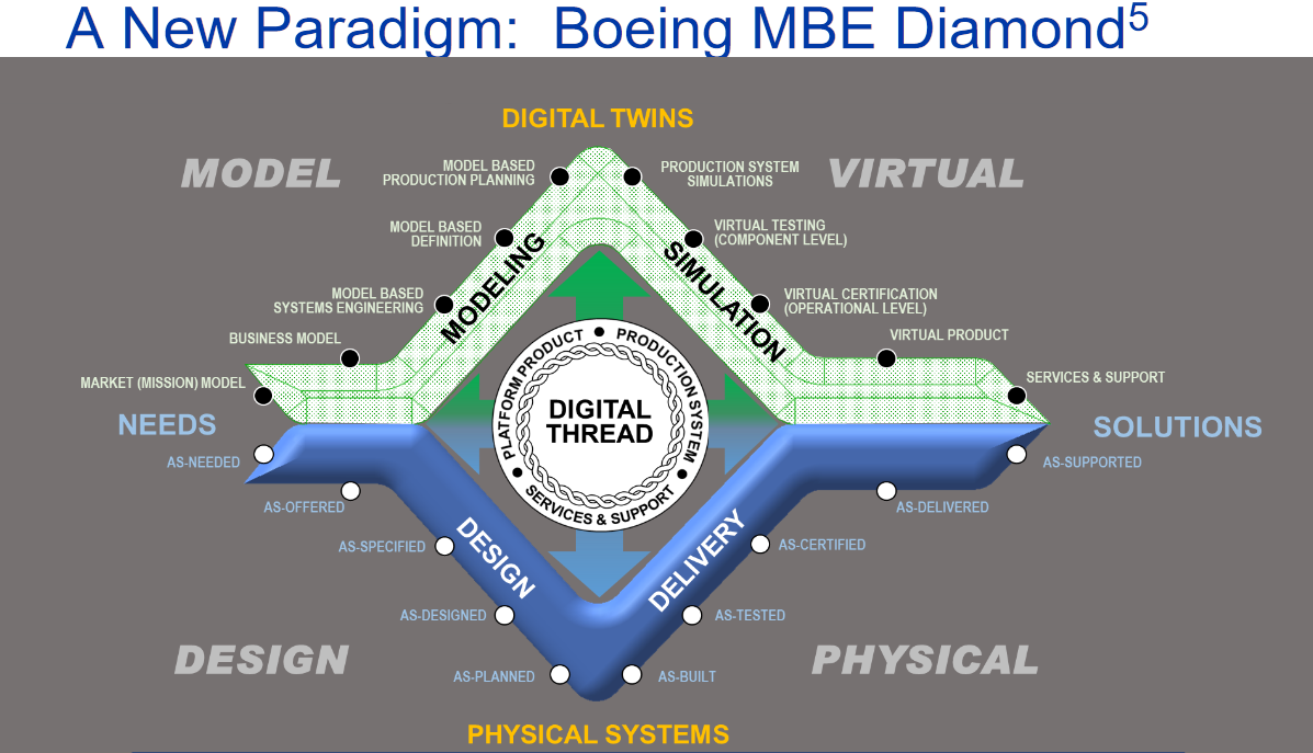 Этот новый вариант V-диаграммы от Boeing упоминает ещё один синоним для цифровой инженерии: **моделеориентированная инженерия/model-**based engineering/MBE. Кроме того, это не V, а MBE-ромб/diamond из двух сложенных своими перегибами V‾‾, где нижняя часть — это классическая V, а верхняя указывает на цифровую инженерию как создание моделеров и исполняемых моделей, которые и порождают модели-описания (например, порождают/generate аэродинамически выгодную форму системы, порождают/generate программу для станка с ЧПУ или программу для 3D-принтера для изготовления какой-то детали из материала). Этот вариант V-диаграммы стал ещё более «метафоричным», ещё более оторванным от реально проходящего в жизни процесса инженерии — ибо в жизни тесно сплетены процессы инженерии систем в графе создателей (скажем, изготовление и разворачивание, настройка моделеров, разворачивание команд инженеров-модельеров), а также тут очень плохо обсуждается независимость разработки разных конструктивов/модулей (а это важно в крупных проектах), плохо обсуждается «непрерывное всё» (когда эксплуатация уже идёт текущей версии, изготавливаются части следующей версии для модернизации текущей версии и проектируются части версии, следующей за изготавливаемой — с жёстким управлением конфигурацией, чтобы чего-то не перепутать).