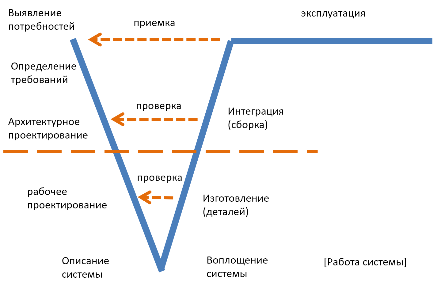Название этой диаграммы происходит от формы латинской буквы V, а форма выражает «логическую»/функциональную линию времени, перегнутую пополам в точке, где укрупнённая стадия описания будущей системы (работа с битами, system definition) переходит в укрупнённую стадию воплощения системы (работа с атомами, system realization). Это такой упрощённый водопад ещё первого понимания жизненного цикла как работ, поделённых на стадии. На этом первые V-диаграммы обычно и заканчивались, но потом иногда начали изображать и стадию эксплуатации**/использования** (работы/функционирования системы, system operation) как длинный горизонтальный отрезок. На нашем рисунке это «иногда» показано квадратными скобочками вокруг [работы системы]. Внешний вид диаграммы больше стал напоминать квадратный корень, но название «V-диаграмма» осталось. Традиционную для системной инженерии с её «от рождения до смерти» стадию вывода из эксплуатации («смерти») на V-диаграммах изображать так и не начали.