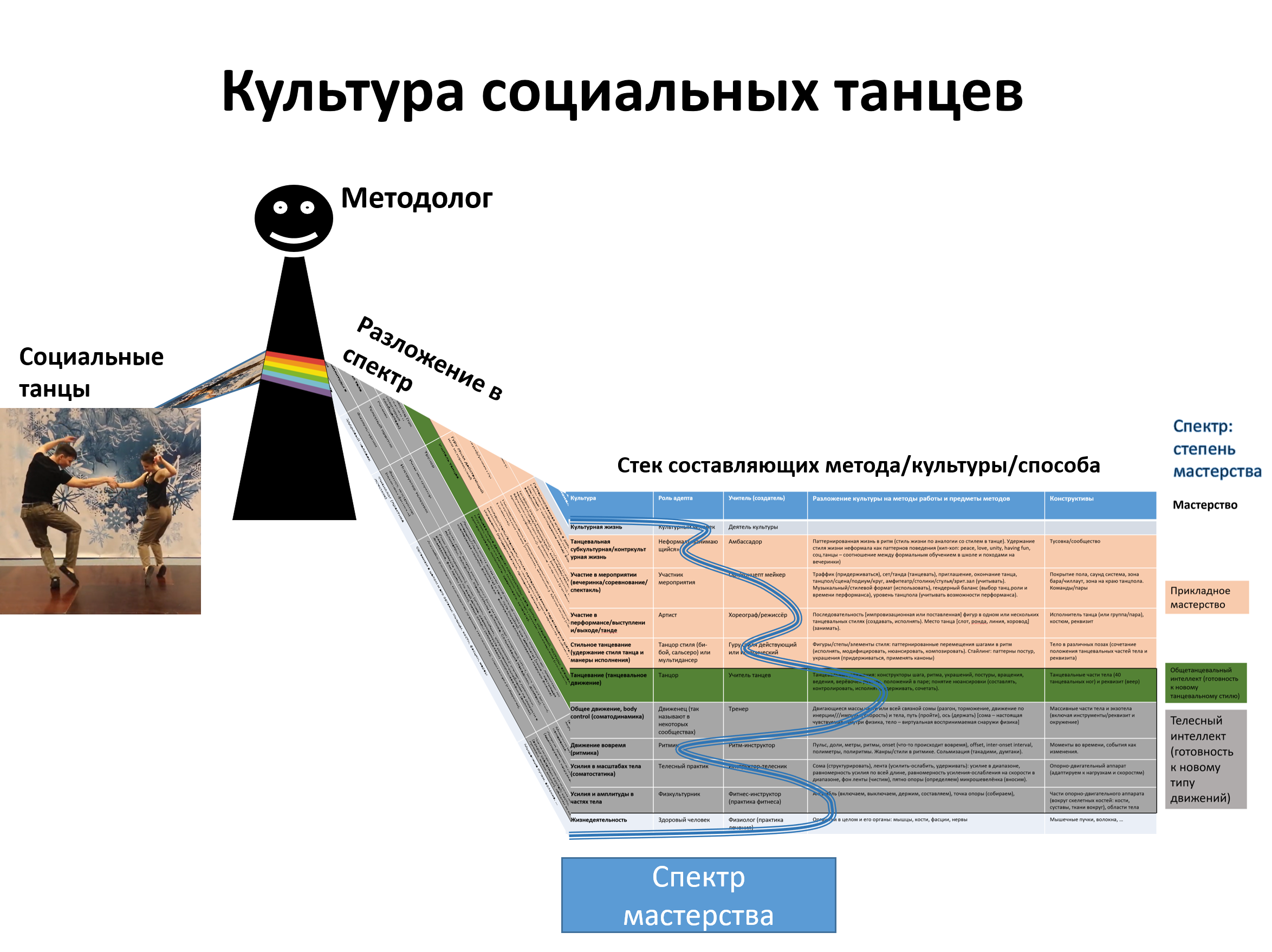 - Составляющие для культуры социальных танцев — это отдельные культуры, каждая работающая со своими предметами методов. Эти культуры и будут «шкалой спектра» для мастерства отдельного агента. Её можно считать как-то упорядоченной в «стек» методов, аналогичный в каком-то смысле платформенному стеку, об этом чуть ниже.