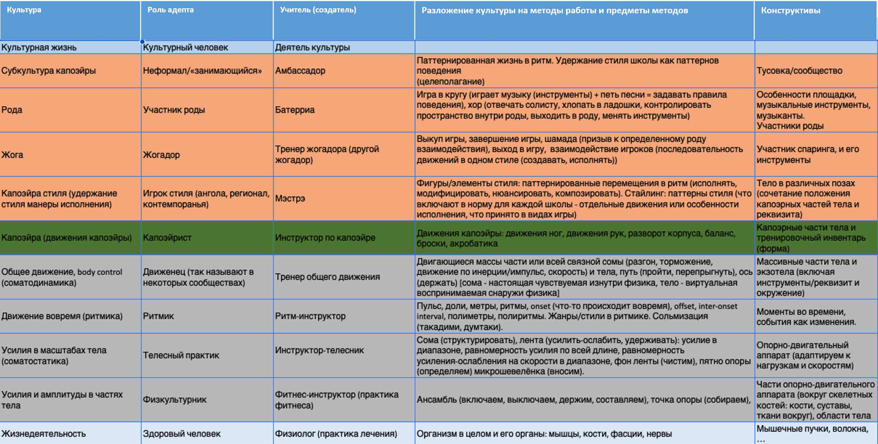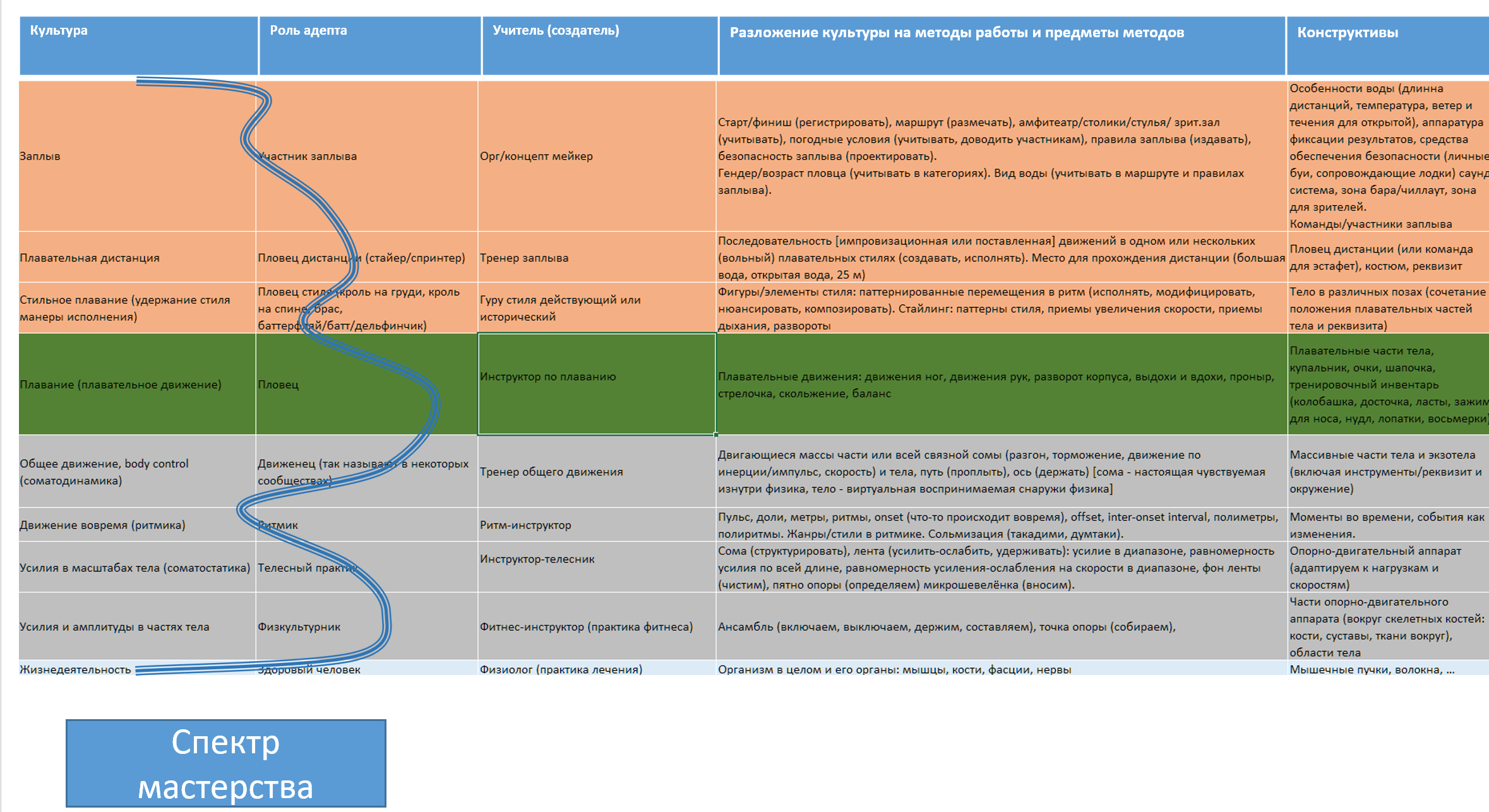 Хорошо видно, что по сравнению с танцами низ стека культур не отличается — методы телесной работы и движения одни и те же, но вот начиная с зелёным выделенного «плавания» (плавательного движения, в танцах это было также выделенное зелёным «танцевание», танцевальное движения) и выше — всё другое.