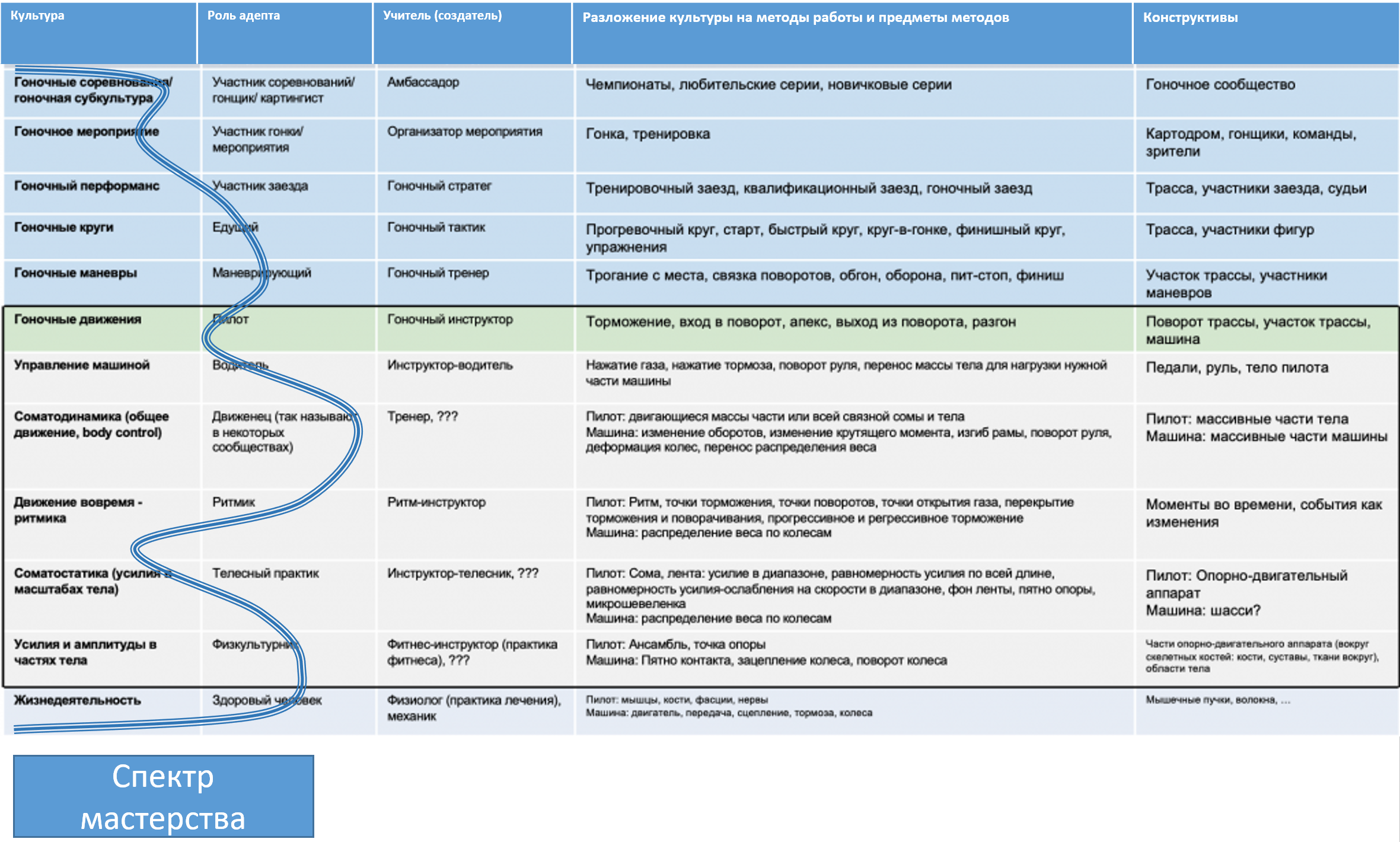 Вот практики (возьмём ещё один синоним) картинга на базе того же разложения телесной культуры, которое мы использовали для танцев и плавания[2]: