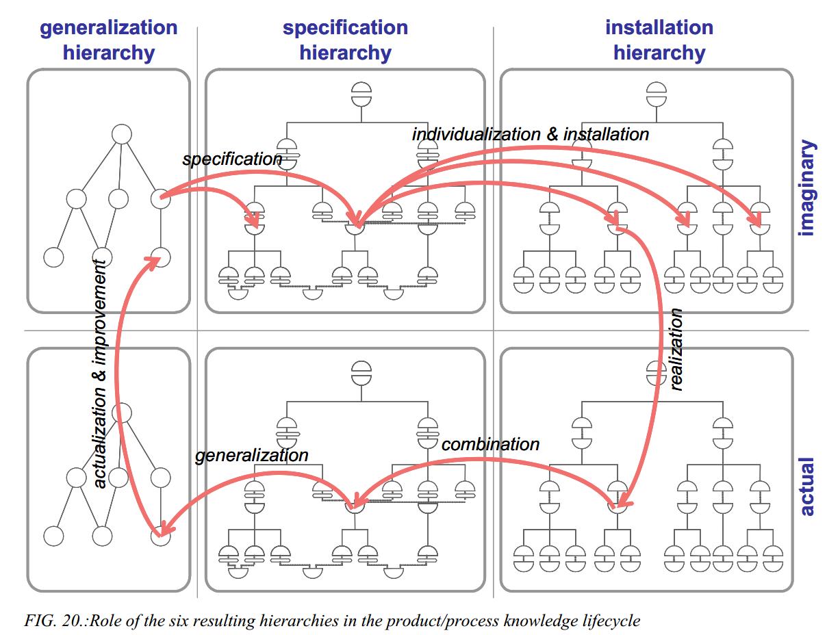 Фреймворк от Gielingh важен тем, что различает generalization hierarchy (иерархия сигнатур), specification hierarchy (выбор вида из рода) и installation hierarchy — уже выбранное по типу и инсталлированное как экземпляры в целевой системе, работающее — и делает это на уровне проектирования («воображаемый проект») и конфигурации конечной воплощённой системы (as built). Вот шесть иерархий, служащих предметами рассмотрения во фреймворке Gielingh — верхний ряд это «воображаемый проект» в его общем/генерализованном виде, а нижний ряд — это с конкретными расчётными функциями и указанными уже моделями конструктивов, самого Gielingh тут интересовала знаниевая работа над проектом, уточнение ролей с какими-то их методами работы и их поддержки со стороны конструктивов: