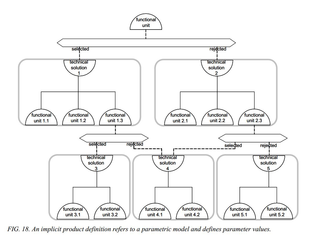 Такая нотация называется гамбургер-диаграмма, где указывается множество кандидатур методов в разложении для какой-то сигнатуры (обсуждение ведётся не в терминах самих методов, а в терминах ролей, работающих по этим методам, Functional Units, FU) и дальше метод назначается какому-то типу конструктивов (Technical Solution), чтобы разобраться с модульностью в порядке формирования концепции системы. «Гамбургер» тут — половинки булки, между которыми «начинка» — это выбор назначений технических решений (конструктивы) на функциональные единицы (роли). В нотации предложено принимать решения по модульности на каждом уровне функциональной декомпозиции, чтобы поощрить выделение модулей в целях унификации. Но современные архитекторы сказали бы, что такой принудительный ход на унификацию модулей — способ ввести межмодульные зависимости, поэтому подход Gielingh не получил особого распространения, умер вместе с очень популярной в 90х годах идеей разработки модулей с повторной используемостью, reuse. Это подход второго поколения системного мышления, где система разрабатывалась как экземпляр, но не как развивающийся вид, не было «непрерывного всего», разработка мыслилась итеративной, но однократной.