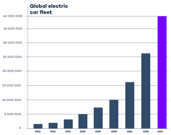 В своих презентациях (например, по транспорту 22 апреля 2020 года[1]) Tony Seba рассказывает, что по итогам «чистого подрыва» с 2025 года все новые автомобили будут электрическими, и (с учётом задержек из-за пандемийных и деглобализационных ограничений) этот прогноз выглядит как до сих пор актуальный. Вот график роста числа электромобилей[2], там хорошо видна экспонента, а в 2024 году ожидается, что 20% проданных автомобилей будут уже электромобилями: