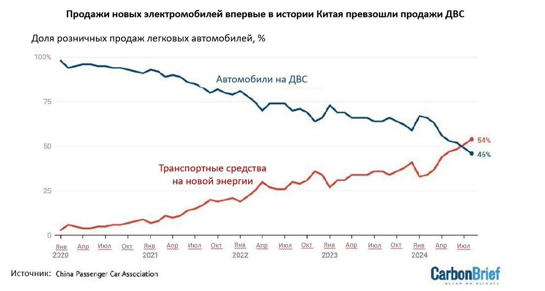 Новость 2024 года: в Китае (самый конкурентный и большой рынок автомобилей в мире) продано в июле больше электромобилей (51.1%), чем автомобилей с двигателем внутреннего сгорания — при этом продажи электромобилей (NEV, new energy vehicles — чистые электромобили и гибриды, заряжаемые от сети) выросли на 28.6% за год[5].