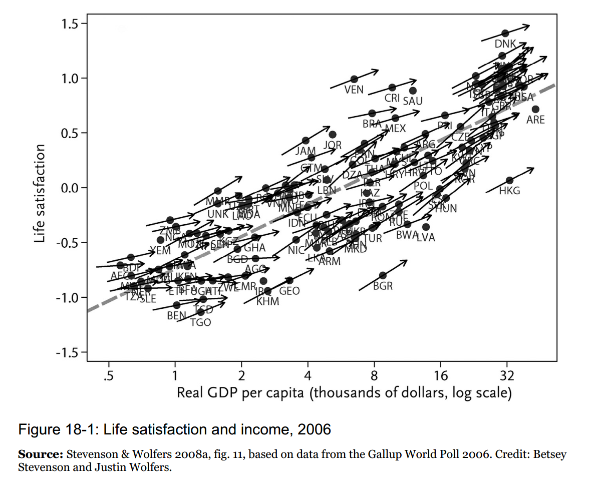 На этом графике доход на душу населения в разных странах приводится по логарифмической шкале и очень чётко видно, что в каждой стране богатые счастливей бедных (угол наклона стрелки каждой страны показывает корреляцию), но уровень счастья в каждой стране сильно отличается, и люди с одинаковым доходом в разных странах счастливы абсолютно по-разному просто от того, что речь идёт о другой стране!