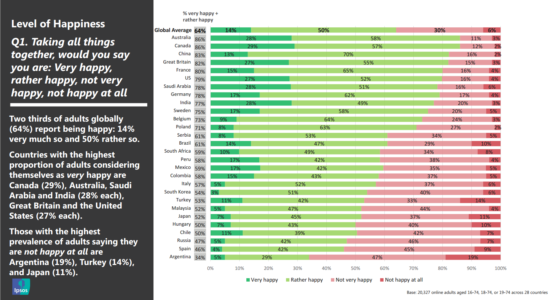 Вот ответ на вопрос о счастье в проведённом агентством Ipsos опросе по удовлетворённостью жизнью в 28 странах в августе 2019 года[2]:
