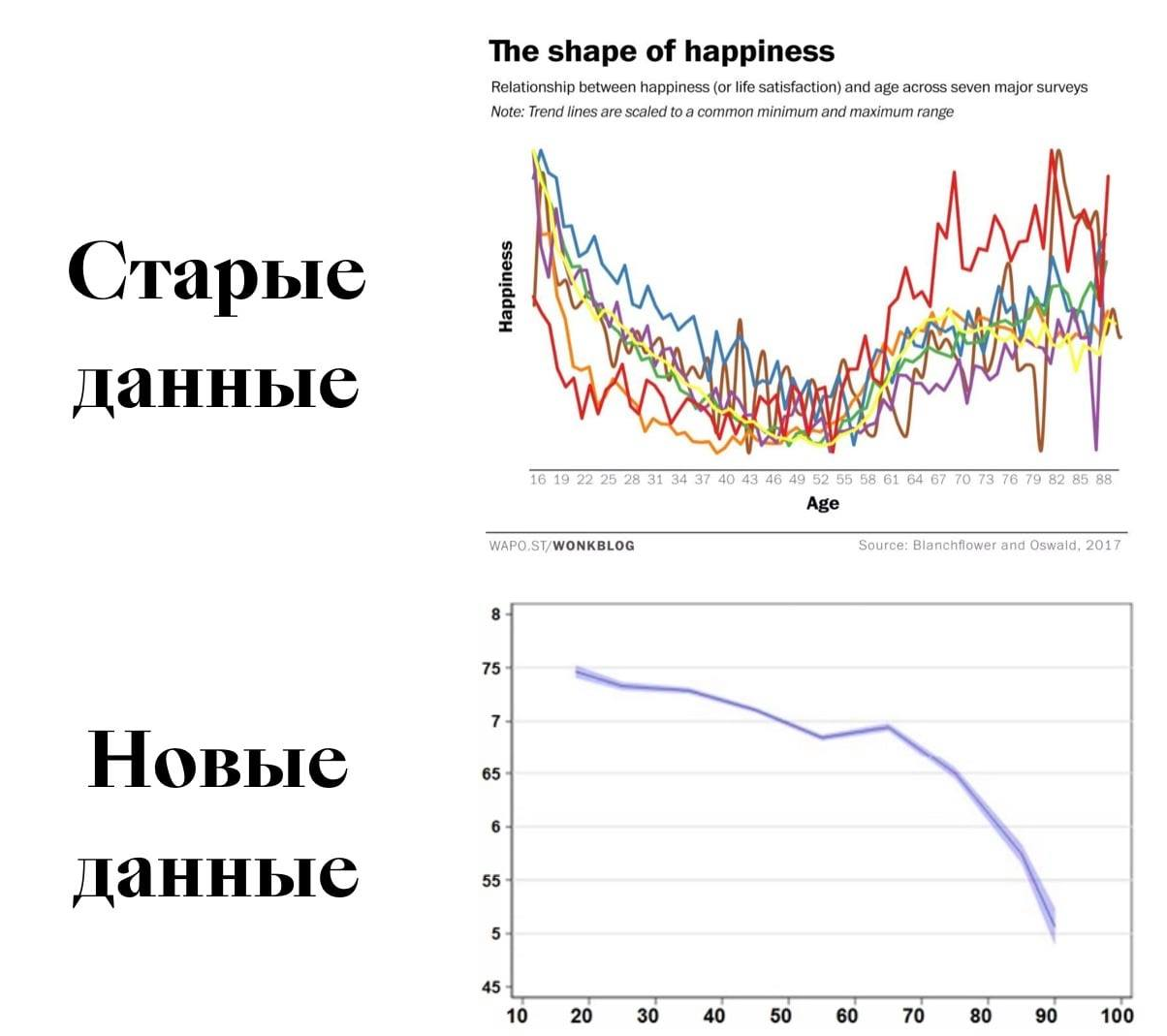 Как поднять счастье? В 2006 году было исследование[4], что уровень счастья не зависит от денег, начиная с какого-то не слишком высокого уровня дохода. Но в прошлом году провели ещё исследования, и выяснили, что чем больше денег, тем больше ощущение собственного благополучия[5]. И это тоже новый тренд, тут тоже всё меняется: в прошлом веке счастье действительно меньше зависело от дохода! И уже понятно, что ответ на вопрос зависит даже не от дохода, а от страны проживания и от возраста!
