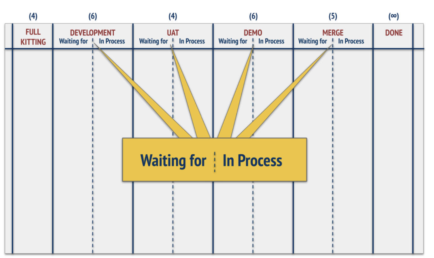 Бэклог задач не показан на картинке. В бэклоге лежат все задачи, над которыми планируется когда-либо поработать. Для релиза отбирается какое-то фич и багфиксов, которые будут выпущены в релизе, в бэклоге представлены задачи, которые описывают необходимые работы по получению этих фич и исправленных багов. Этот отобранный набор готовится к работе (проводится предварительная подготовка/Full Kitting): продумывается, что именно пойдет в работу, нужно ли ещё что-то сделать, чтобы задачу можно было взять в работу, и так далее. Отобранные задачи попадают в колонку «Full Kitting» и в дальнейшем выполняются.