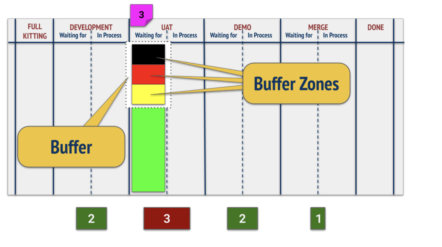 Во-первых, есть буфер типа «Барабан-Буфер-Канат»/буфер ББК/Drum-Buffer-RopeBuffer**/DBRBuffer**. Это аналог буфера товарно-материальных запасов, предназначенный для того, чтобы ваше ограничение (самое медленное из бутылочных горлышек), которое, собственно, ограничивает выпуск, работало на максимуме (близко к 100% загрузке – это единственная из рабочих станций, которая может работать с такой загрузкой). Буфер ББК позволяет обеспечить стабильность выпуска: ограничение работает бесперебойно. Достигается это за счёт того, что команды начинают пользоваться усовершенствованными версиями Канбан-досок[3] – досками «Барабан-Буфер-Канат»[4]: