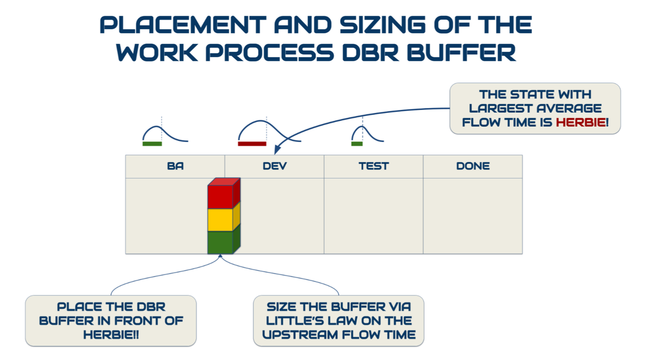 Этот буфер может иметь минимальное количество задач, но не имеет максимального. Рассчитать минимальный размер буфера можно по закону Литтла WIP = Throughput * average Flow Time предыдущих станций перед ограничением. Далее надо будет следить за состоянием буфера: если он исчерпывается, то это означает, что скоро ограничение будет простаивать, что приведет к потерям выпуска команды. Кроме того, следующая задача «на вход» в команду подаётся лишь тогда, когда ограничение взяло в работу какую-то из задач из буфера. Когда разработчики (в данном случае самая медленная станция) берут в работу задачу из бэклога, то посылается сигнал о том, что «на вход» в команду можно подать следующую задачу (обработкой которой займутся бизнес-аналитики/BA, после чего положат её в буфер). Аналитики и тестировщики могут простаивать, ожидая, пока разработчики возьмут следующую задачу, а простой разработчиков должен быть минимальным (помним, что 100% загрузки все равно не должно быть даже у ограничения).
