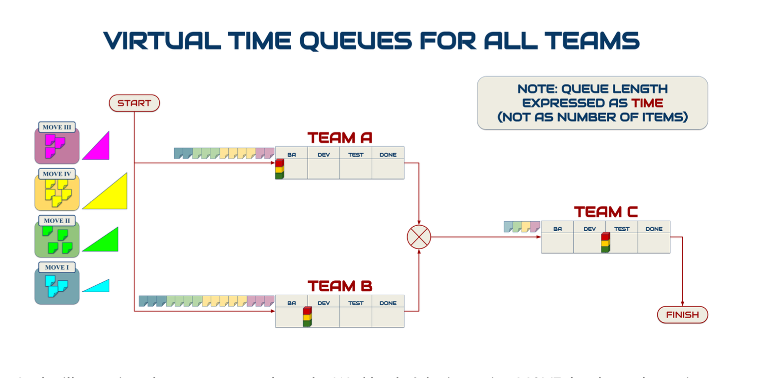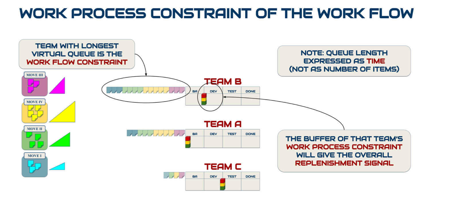 Следующий тип буфера в TameFlow – буфер производственной мощности/capacity. Для реализации проекта требуется совместная работа нескольких команд. Для расчёта сроков и скорости выпуска нужно знать, какая команда самая загруженная (максимальная загрузка команды как рабочей станции/capacity utilization), и как лучше управлять ресурсом этой команды. Для этого мы должны проявить очередь перед каждой командой: очередь релизов, очередь спринтов или MOVEs (minimal outcome-value target, в отличие от спринта ограничивающий не время выполнения, а минимальный размер выпускаемого объекта или количество таких объектов)[6]. Далее подсчитать, сколько времени у команды займет обработать всю имеющуюся очередь. Команда, которая справится со своей очередью последней, и есть бутылочное горлышко (на уровне подразделения), а её самая медленная рабочая станция будет выступать ограничением для всего проекта[7]: