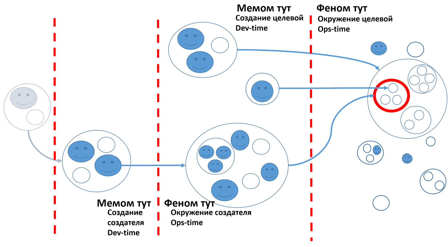 Наконец, ваше предприятие может выпускать и не вещь, и не части вещи, и не описания вещи или её частей, а изготавливать другого создателя (на картинке это «мемом» во времени создания, dev time). В таких случаях можно часто услышать про «консалтинговые проекты», в рамках которых «что-то меняется в организации-клиенте» на основе предложенных компанией моделей. Фактически в рамках таких проектов меняется часть предприятия или предприятие в целом (обновляется до новой версии), вот эту часть предприятия в новом состоянии можно назвать «нашей вещью». Вы помогаете другому предприятию изготовить новую версию части предприятия, вероятно, создать новую оргвозможность, как создают её нефтеразведчики для нефтедобытчиков. А уже изменённый создатель изготавливает вещь/целевую систему. Более подробно на системной схеме проекта это выглядит так: