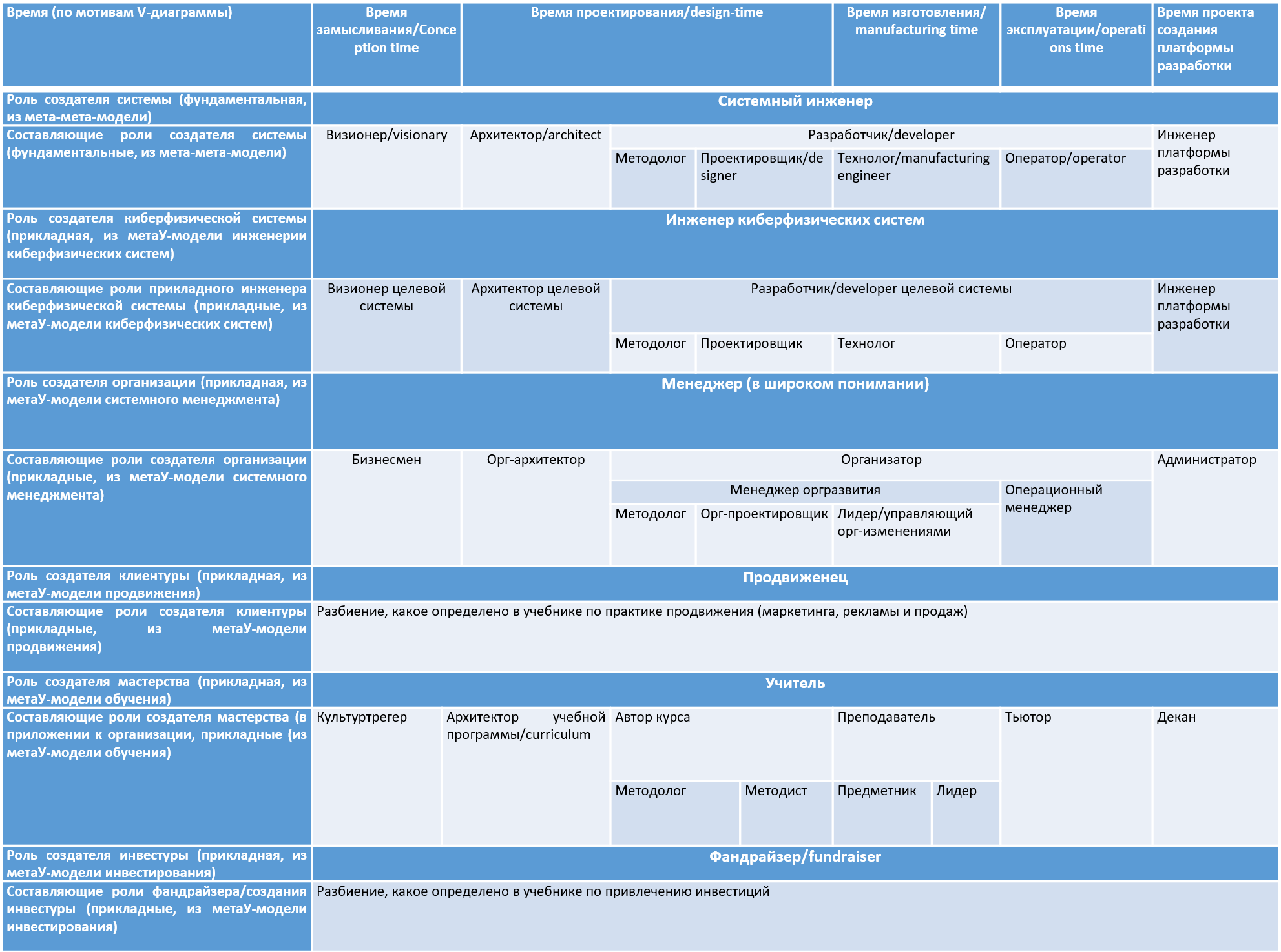 Помним, что ни по поводу гибридных названий должностей, ни по поводу наименований типовых составляющих ролей инженера, менеджера, учителя, продвиженца и т.д. консенсуса нет, каждое сообщество имеет тут свои традиции. В разных организациях и разных предметных областях даже привычные наименования должностей и ролей означают совершенно разное. TeamLead в веб-разработке и где-нибудь в лесотехническом машиностроении может означать очень разные обязанности, ещё и существенно зависящие от страны и организации, а также от года, в котором ведётся обсуждение: в прикладных видах инженерии, включая инженерию предприятия всё стремительно меняется, включая «модные» и «локально правильные» названия типовых должностей. А ещё TeamLead — это должность (не роль!) «начальника», и мы помним, что заниматься на этой должности приходится чем угодно, роли начальника могут быть любыми, начальственные должности — это «джокеры» в смысле ролей. Конечно, начальники (по должности!) могут выполнять и роли инженеров организации-создателя (менеджеров), и прикладных инженеров каких-то создаваемых систем: киберфизических систем, мастерства, клиентуры и т.д.