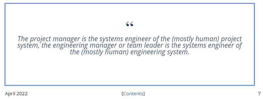 Позиция единства инженерного взгляда как минимум на инженерию и менеджмент уже давно признаётся системными инженерами киберфизических систем (иногда их называют «классическими системными инженерами»). Вот в журнале «Project Performance Engineering Systems Engineering News» в апреле 2022 это даётся на седьмой странице обведённым в рамочку[2], чтобы классические системные инженеры об этом не забывали: