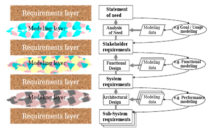 После того, как в проект вбрасывалась концепция использования «на трёх страничках», выделялись деньги — и проектом дальше занимался инженер по требованиям. Он делал реверс-инженерию надсистемы и документировал в виде спецификаций требований описание целевой системы, которая должна будет удовлетворить потребностям. Разработчики системы (прикладные инженеры, архитекторы, специалисты по инженерным обоснованиям) тем самым отсекались от общения с внешними проектными ролями. Это пытались исправить ходом на «модели требований», где кроме собственно формулировок требований пытались отметить, что кто из внешних проектных ролей говорит, на чём настаивает (переход на язык предметов интереса и интересов вместо языка конкретных значений, а также указание ролей, высказывающих свои интересы и их конфликтов, которые нужно как-то решать).