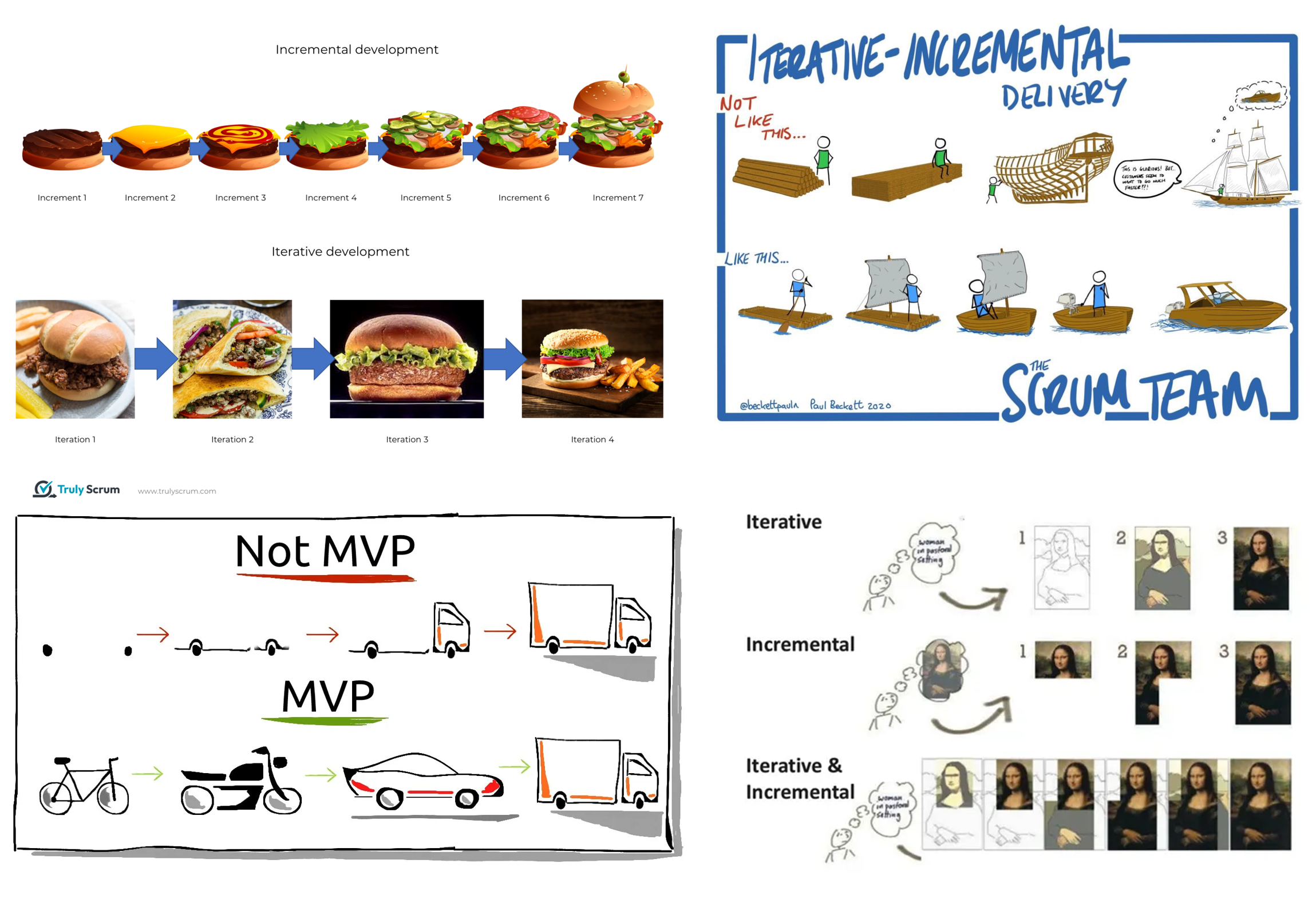 Теперь разберёмся с постепенностью: это наша знакомая эволюционная/непрерывная разработка системы, она же создание MVP, а затем развитие системы. Раньше её описывали иногда как «инкрементальную разработку», а иногда как «итеративную разработку», противопоставляя их друг другу. И приводили самые разные картинки, которые нагло врали (из лучших, конечно, побуждений! Ибо приводимые метафоры не полностью соответствовали сути явлений). Вот типичные примеры этих кривых метафор: