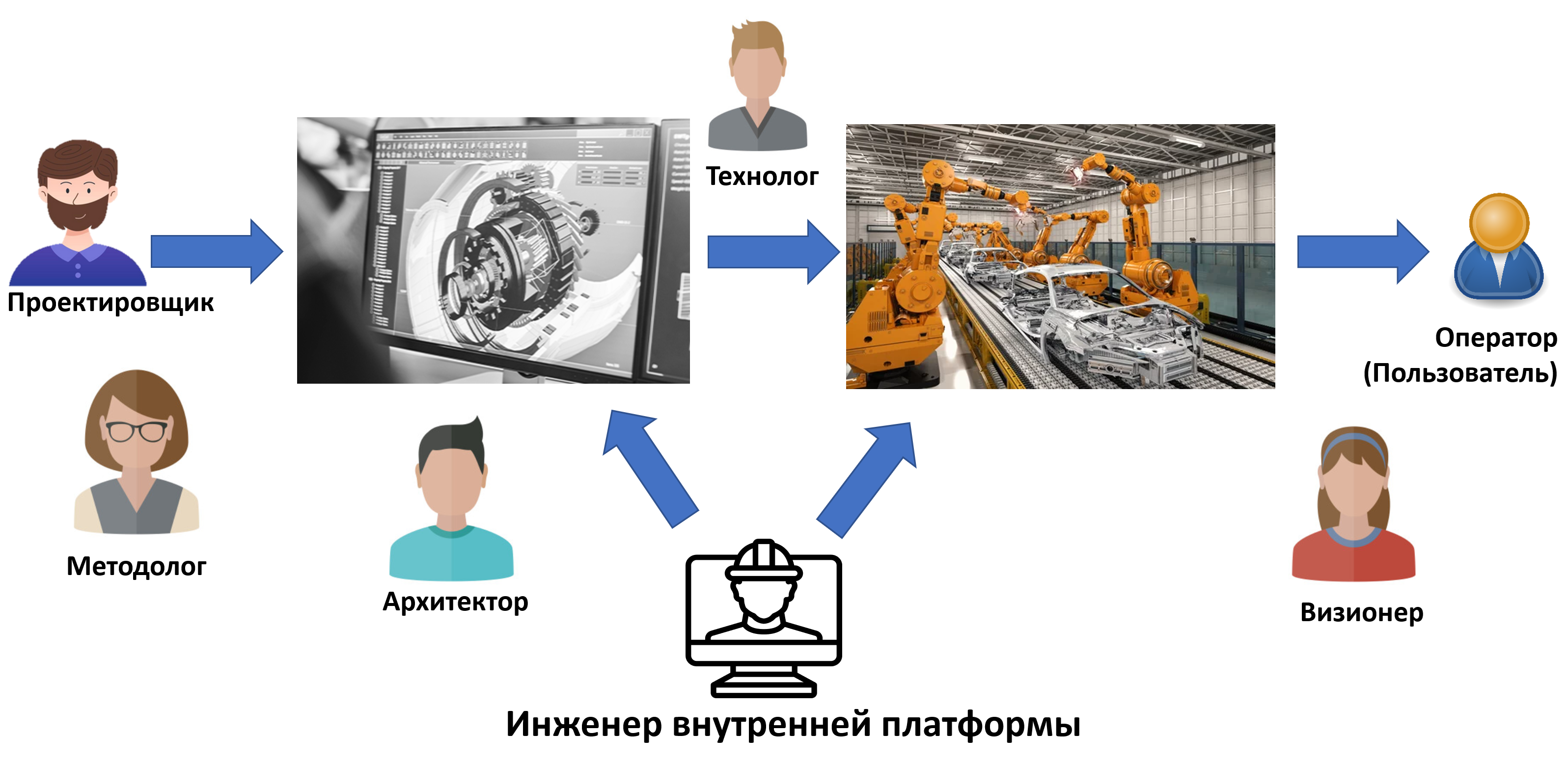 Проектировщик в соответствии с рекомендациями прикладного методолога, ответственного за динамический аспект системы и в соответствии с принятыми архитектором решениями делает проект/design системы и передаёт его технологу, который проводит этот проект/design через изготовление, сборку, обоснование успешности (тестирование), разворачивание и пуск в эксплуатацию. Оператор (он же пользователь) работает во время эксплуатации системы, визионер понимает текущую (или будущую!) ситуацию в эксплуатации и разработке — и планирует очередь реализации новых фич системы, передавая её проектировщику (то есть это не однократный проход по процессу, это непрерывная разработка, continuous development). Отдельно тут инженер внутренней платформы разработки (internal development platform), который готовит инструментальный «конвейер», на котором работают все остальные роли — инструменты методолога, проектировщика, архитектора, технолога, визионера. Конечно, «инженер внутренней платформы разработки» внутри себя рекурсивно содержит все упомянутые роли: в маленькой разработке софта это может быть пара-тройка человек, а вот в ракетостроении — люди, которые строят ракетный завод, да ещё и разворачивают софт моделирования для конструкторского бюро.