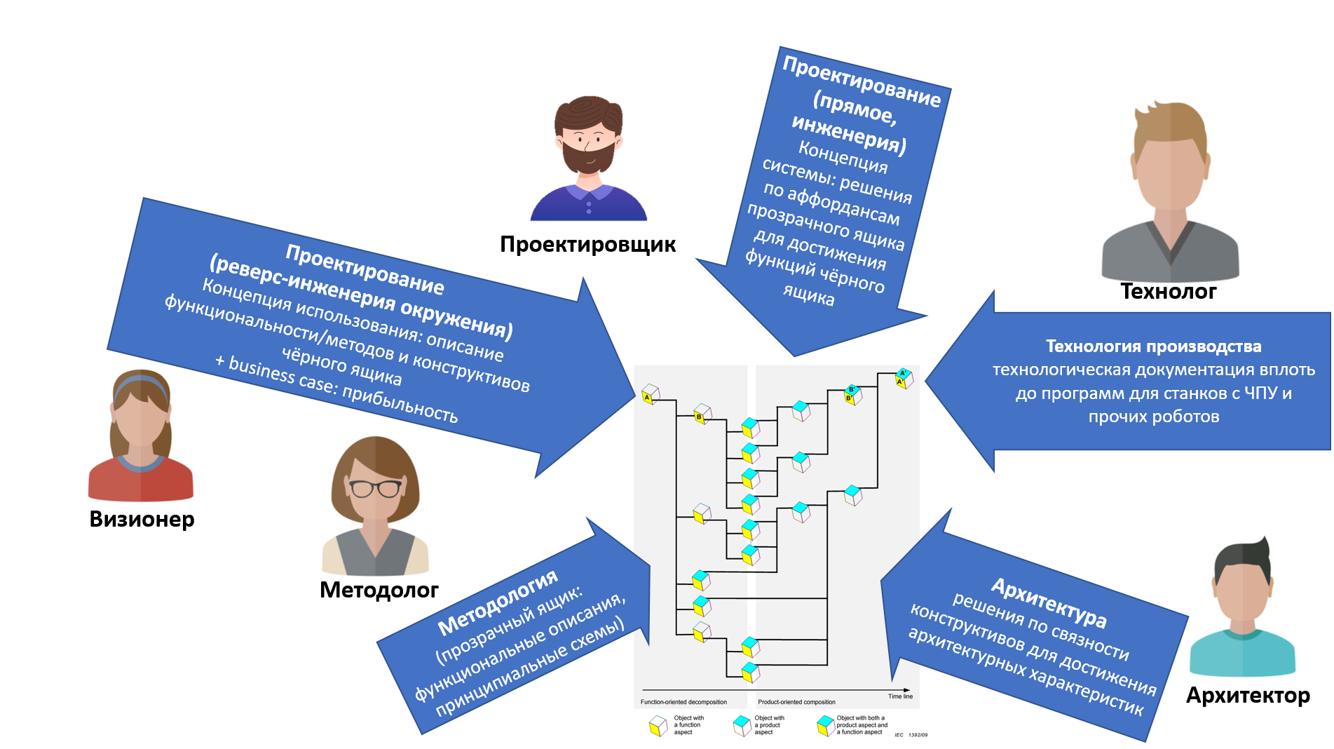 На картинке намеренно проектировщик отвечает за конструкцию и чёрного ящика (спецификация интерфейсов, учёт компоновки, сама система целиком — это ведь не только функциональный объект в надсистеме, но и конструктив тоже), и для прозрачного ящика (подбор или даже изобретение комплектующих и компоновки такой, чтобы выдавать необходимый набор функций). И прикладной методолог и за внешнюю функциональность, и за внутреннюю отвечает. Совместная работа всех, но всё-таки разделение труда по видам описаний, в которых профессионализируются. Визионер же ничего не разрабатывает, но отвечает за то, чтобы это был бизнес (а если не бизнес, а благотворительность, то было бы понятно, кто добровольно оплачивает эту благотворительность, а не обнаруживает это уже после того, как потрачены ресурсы на никому не нужную разработку).