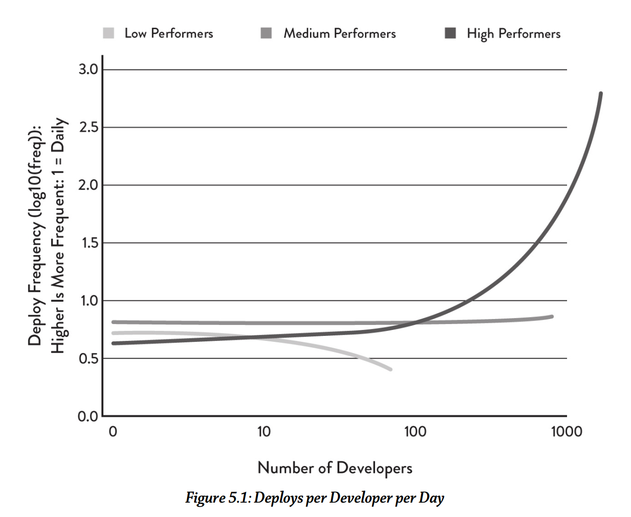 Он показывает, что в высокопроизводительных организациях (на графике — high performers) при росте числа разработчиков число завершённых частей системы, готовых для сборки (deploys, включение в состав готовой системы) растёт линейно, или даже более чем линейно — за счёт всех этих методов принятия архитектурных решений, принятия решений операционного менеджмента по ограничению размера единицы выполняемой работы (small batch size, «малый размер обрабатываемой партии») и т.д. В организациях умеренной производительности скорость от добавления разработчиков остаётся примерно одинаковой. А вот в организациях низкопроизводительных (в книге показывается, что они не используют современный гибкий инженерный процесс, а придерживаются старинного «водопада») с добавлением людей в команду производительность быстро падает: они не могут решить проблемы работы «команды команд» («бригады бригад», коллектива проекта в целом).