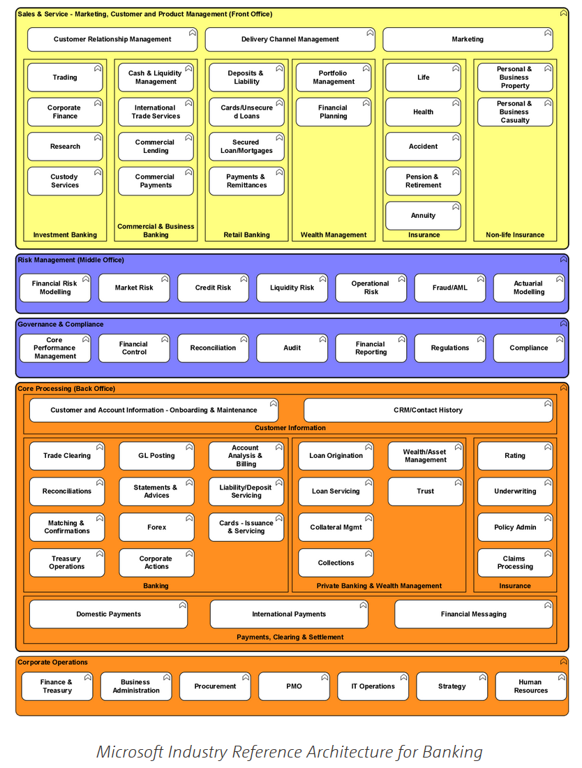 Вот пример справочной архитектуры для банковской деятельности[4], и обратите внимание на невозможность обсуждения архитектуры — непонятны взаимодействия между отдельными функциями, это не функциональная диаграмма/принципиальная схема предприятия, а именно что декомпозиция функций. То есть вроде как в названии слово «архитектура» есть, а ничего про интерфейсы и взаимодействие модулей мы сказать не можем, обсудить связность/coupling не можем: