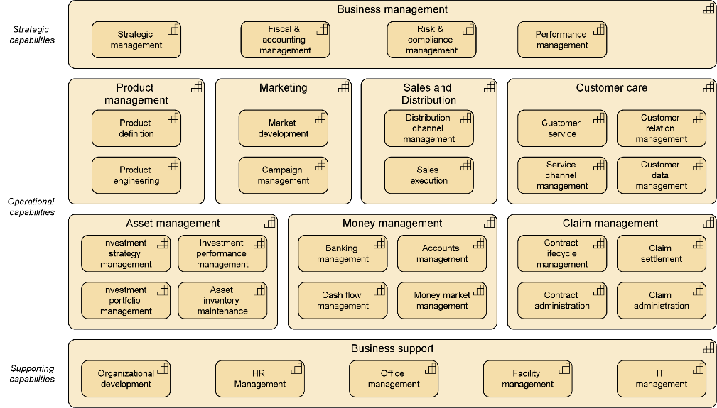 Справочная архитектура предприятия ArchiSurance из примера использования языка ArchiMate выглядит так[6]: