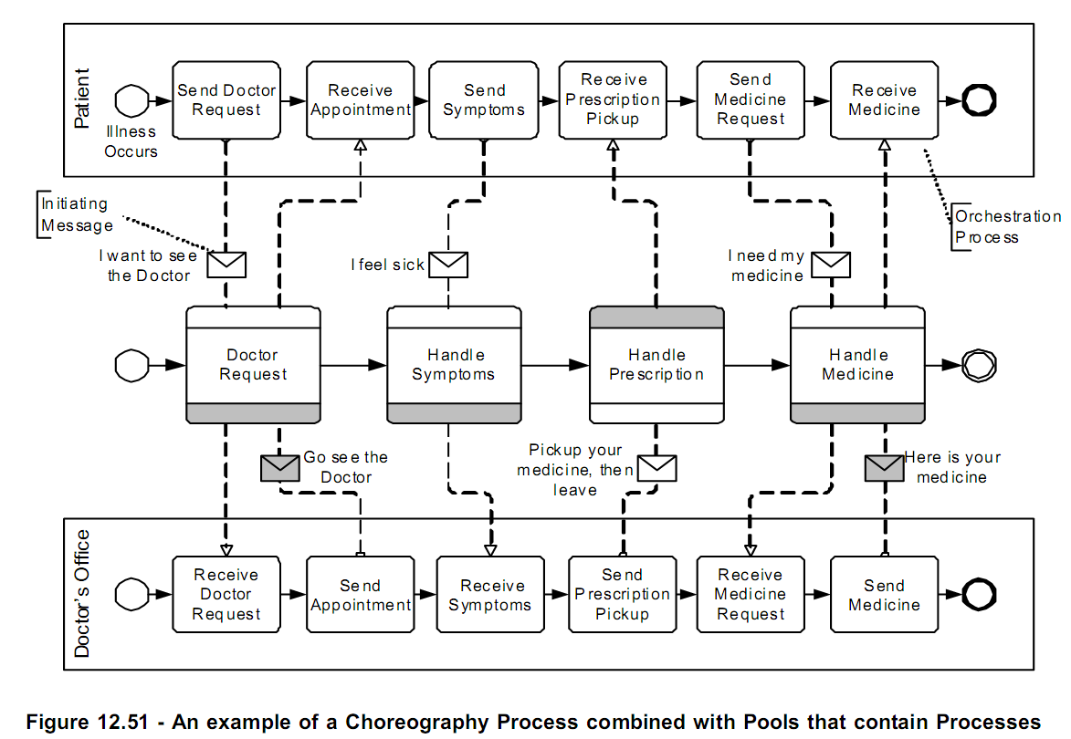 В начале 21 века позиции проектного управления были существенно подвинуты сторонниками процессного управления, которое главным образом развивалось в среде «автоматизаторов» (айтишников). Увы, из этой истории тоже ничего хорошего не получилось. Вот пример описания простейшего «процесса» похода к доктору, который выписывает рецепт к врачу, это выдержка из стандарта Business Process Model and Notation (BPMN) 2.0[1]: