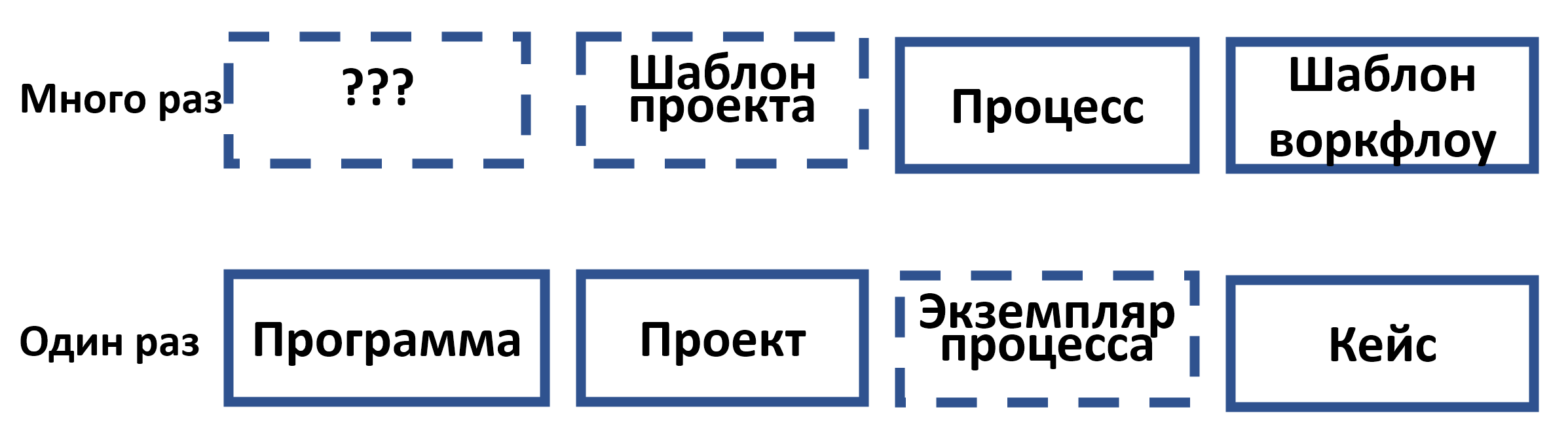 А что там с практиками в проектном управлении, как там работают с «одинаковым» в предметной области? Там ровно наоборот: всё про работы и их уникальную логистику в части «экземпляров» применения практик, и намеренный уход от любого обсуждения «типовых работ» (хотя понятие «процесс» как практика используется, начиная со второго поколения — но только для процессов проектного управления, а не для процессов самого проекта, ибо «какие такие процессы? У нас всё уникально, у нас экземпляры!». В процессном управлении невозможно поставить даты выполнения работ, а проектном управлении невозможно завести работу без даты. Но поскольку практики и связанные с ними работы таки существуют, софт (но не учебники!) проектного управления поддерживает «шаблоны проектов». И даже если простейший софт (например, MS Project) не поддерживает, то мало кто начинает работу над планированием нового проекта с пустого разбиения работ. По нормам проектного управления разбиение работ обязано содержать даты начала каждой работы и ресурсы на её выполнение, поэтому невозможно иметь разбиение работ без привязки ко времени (такое описание будет, скорее, описанием практики, «описание процесса::практика работы::работа»), но в жизни просто берут предыдущее описание проекта с проставленными датами начала и конца работ, и чуть-чуть редактируют состав работ (или даже не редактируют), а вместо старых дат ставят новые. Так что «шаблона проекта» вроде бы нет (каждый проект уникален!), но по факту он есть.