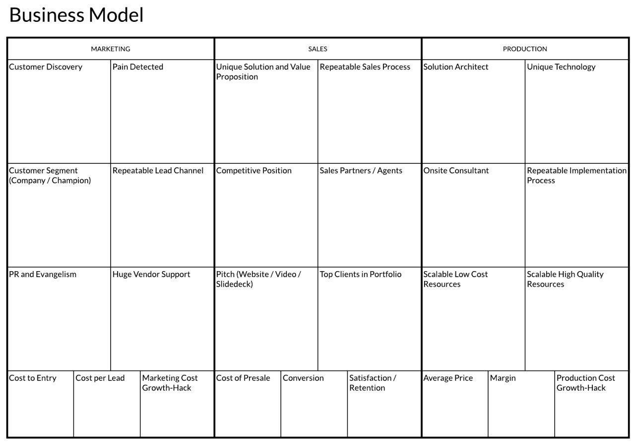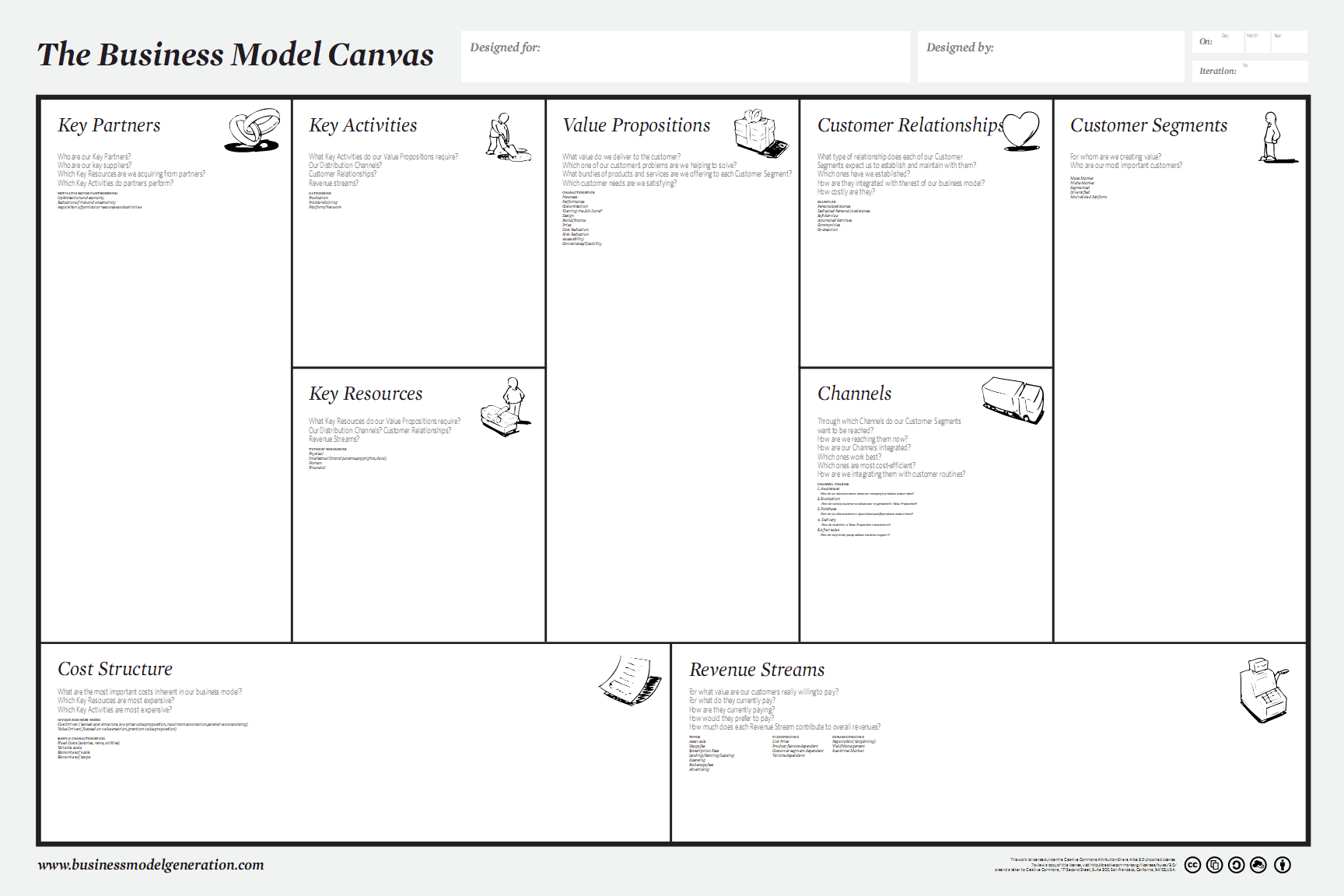 Самая распространённая форма представления бизнес-модели — это «холст»/canvas, «нетабличная таблица», обеспечивающая явн****ые тип****ы метаУ-модели для важных объектов внимания модели какой-то предметной области (тут это бизнес-моделирование)****, указываемых в клетках таблицы. Инструкция по пользованию «холстами» проста: печатайте форму на бумаге размера A2 во множестве экземпляров, вешайте на стенку (закрепляйте на флипчарте) и заполняйте потом фломастерами. Когда поймёте, что это всё плохо, снимайте лист бумаги, комкайте его и выкидывайте в урну (итерации стратегирования должны быть дешёвыми и быстрыми в части документирования моделей!), закрепляйте очередную пустую форму и продолжайте моделировать, пока результат не понравится. Оставьте конечный результат на этой форме, дальше разошлите фотографии всем заинтересованным. Важно, что через некоторое время стратегирование продолжится — смело комкайте и этот вариант, рисуйте новый на новом листе.