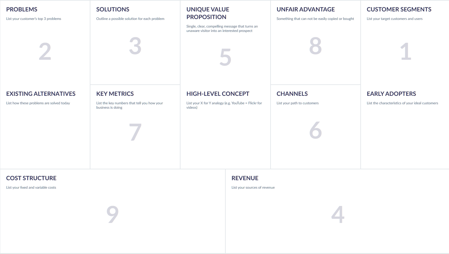 В результате в мире прекратили документировать бизнес-планы, а все акселераторы стартапов, бизнес-инкубаторы, инвестфонды и прочие перешли на рассмотрение бизнес-моделей в форме заполненных холстов, где тип объекта бизнес-моделирования указывался прямо в холсте. Появилось множество работ, которые или подтверждали онтологические выборы Osterwalder (например, «Business Model Ontology (BMO): An Examination, Analysis, and Evaluation»[6], 2016), или пытались что-то улучшить. Вот пример попытки такого улучшения, lean canvas от Ash Maurya[7]: