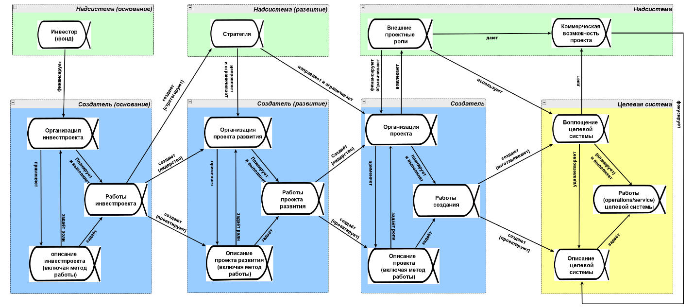 Напомним системную схему проекта (со всеми обычными оговорками: в цепочке создания может быть совсем другое число звеньев, это уровень мета-мета-модели, а надо приводить к ситуационной модели, графическая форма может быть неудобна в работе) и посмотрим на место стратегии как альфы: