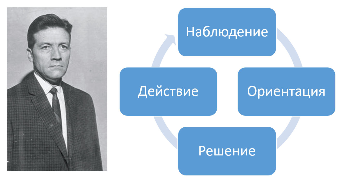Этот цикл военный лётчик Джон Бойд сформулировал на примере военного сражения, но потом это было переформулировано для ситуации рыночной конкуренции: