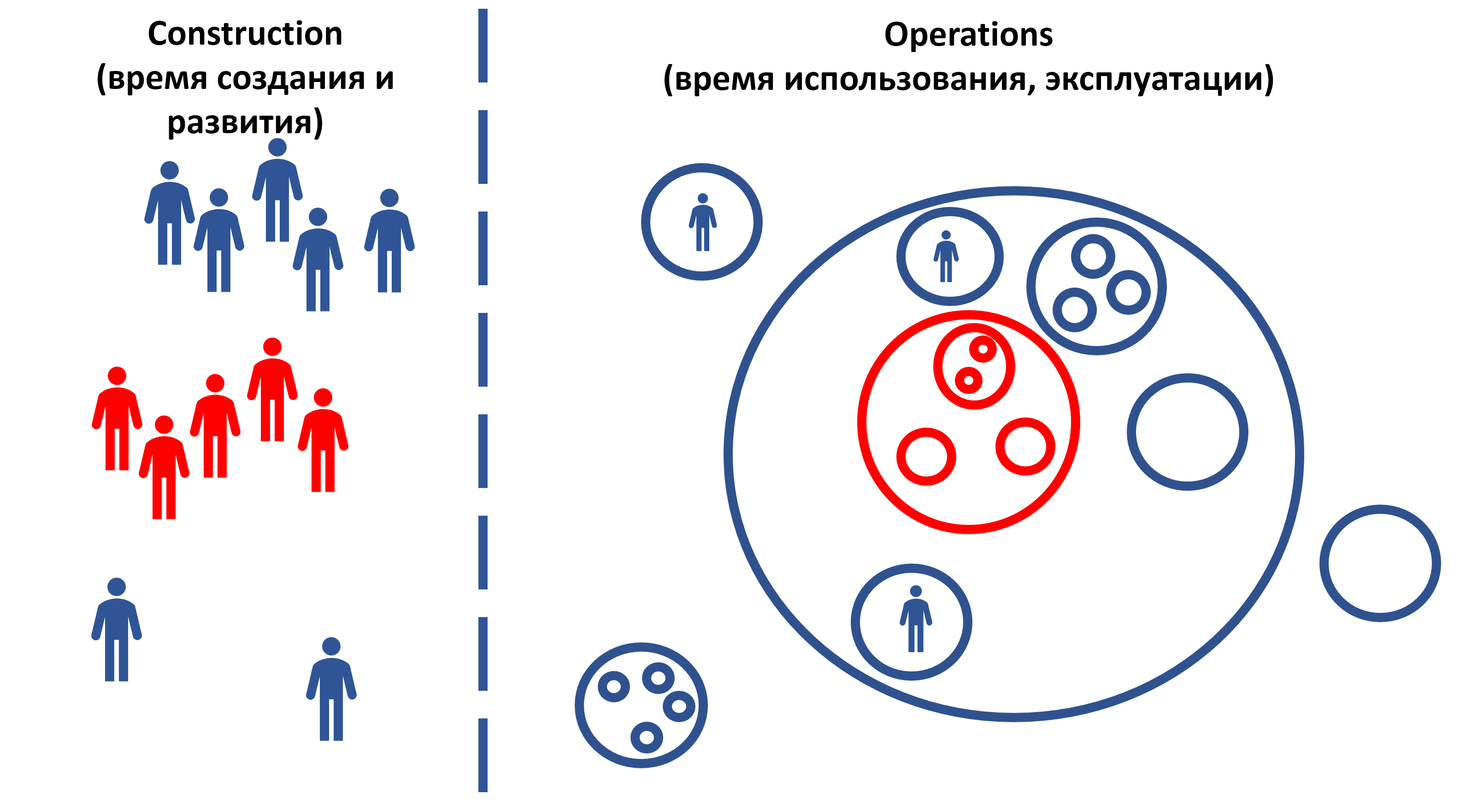 Внешние проектные роли времени использования показаны синими человечками, но это не люди. Это роли, исполнять их могут и люди, и люди с компьютерами, и команды, и фирмы со всеми их людьми и оборудованием. В рассмотрении operations такие внешние роли, например, «пользователи», при этом мы рекомендуем общий тип «пользователь» нашей мета-мета-модели всегда заменять на тип роли из мета-модели (предметной области целевой системы) — в играх это игрок::пользователь, в бухгалтерских системах бухгалтер::пользователь и аудитор::пользователь. Но внешними проектными ролями могут быть и вредители/хакеры, и инспекторы внешних надзоров — кто угодно, кто взаимодействует с целевой системой в operations time. Эти роли показаны в кружках, чтобы подчеркнуть, что это тоже системы в окружении (роль — ролевой объект, который играется каким-то агентом как конструктивным объектом).