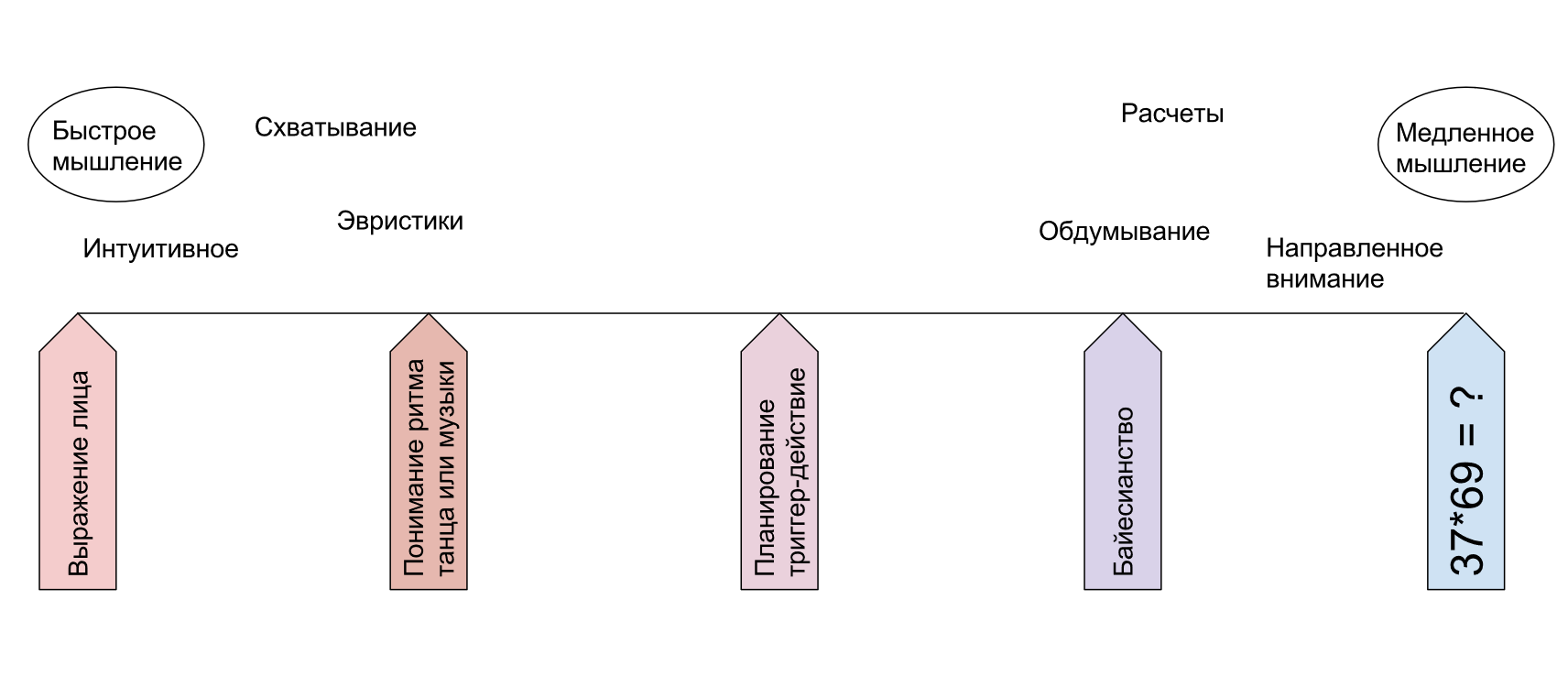 Даниэль Канеман утверждает[6], что у человека есть два механизма мышления: быстрое малозатратное интуитивное S1 и медленное трудоёмкое осознанное S2, включающееся при появлении каких-то проблем при использовании «быстрого» интуитивного мышления. Вот S2 представляет собой возможность последовательного задействия актов мышления S1 и тем самым возможность логического последовательного/пошагового мышления.