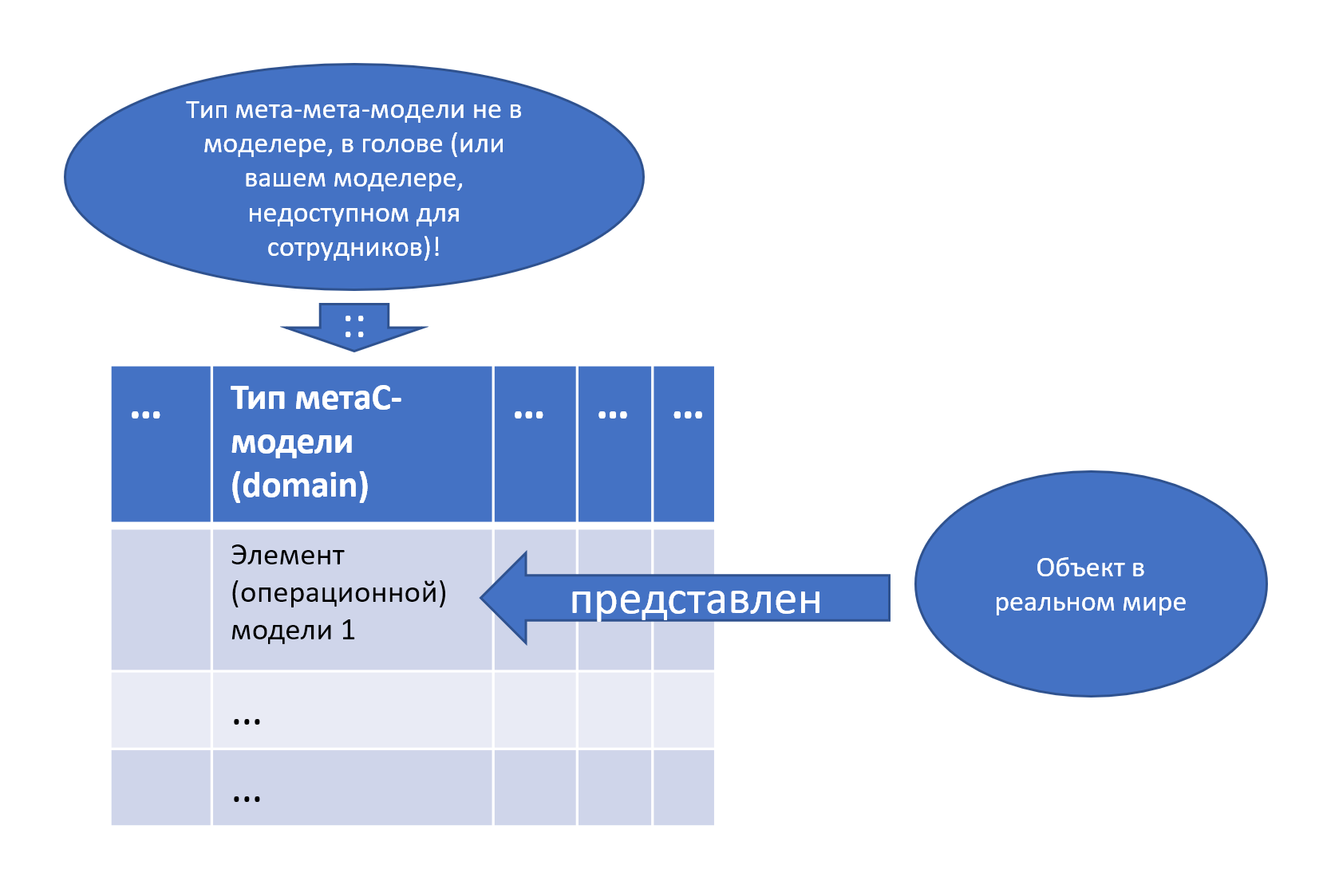 - значения модели (никаких «мета») для каких-то объектов в ячейке из строк этой таблицы. Ещё нужно учесть отношение репрезентации между описанием в ячейке и каким-то описываемым объектом проекта, его в табличке нет, как нет типа мета-мета-модели. Но описываемый объект есть, в ячейке только его описание!