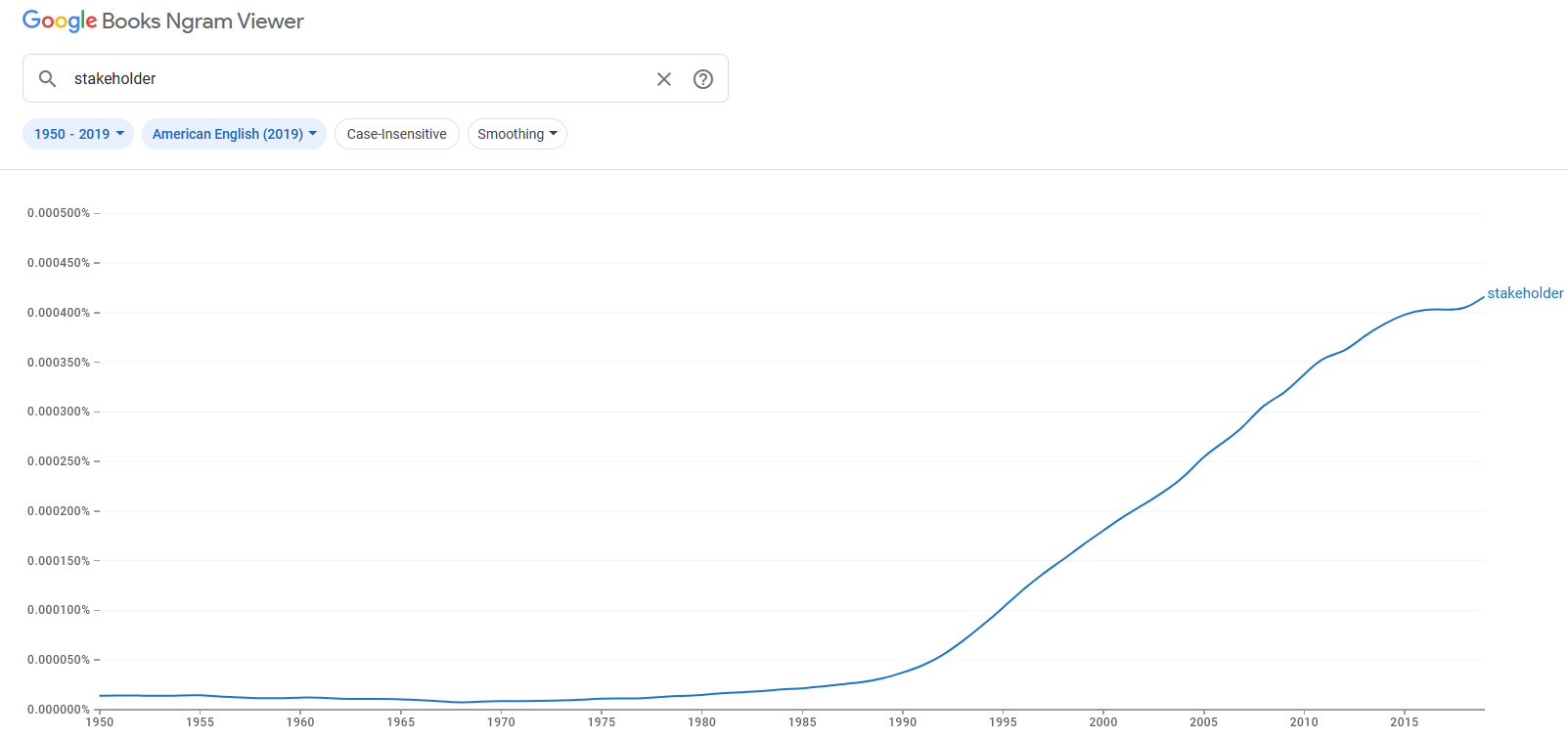 Вот график частоты упоминания слова stakeholder в библиотеке англоязычных книг Гугла[3], и это примерно отражает распространение системного подхода в его второй версии (прежде всего в литературе по проектному управлению, ибо там первыми начали говорить про людей в системах-создателях, а затем в системной инженерии. Проектное управление как метод менеджмента тоже появилось как приложение системного мышления к менеджменту, как и системная инженерия появилась как приложение системного мышления к инженерии):