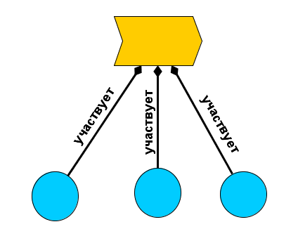 Во многих графических языках моделирования стрелочки с ромбиками на конце как раз означают отношение состава, причём целое там, где ромбик, а часть — где ромбика нет. Жёлтый «шеврон вбок» — это стилизованная стрелка, означает, что что-то меняется во времени, им обозначен «процесс». А голубые кружочки означают физические предметы, участвующие в этом процессе. Голубые кружочки — это части процесса как целого. В пределе можно считать, что «процесс» — это просто такая составная вещь, которая состоит из участвующих вещей — это если отношение участия трактовать просто как классическое отношение часть-целое.